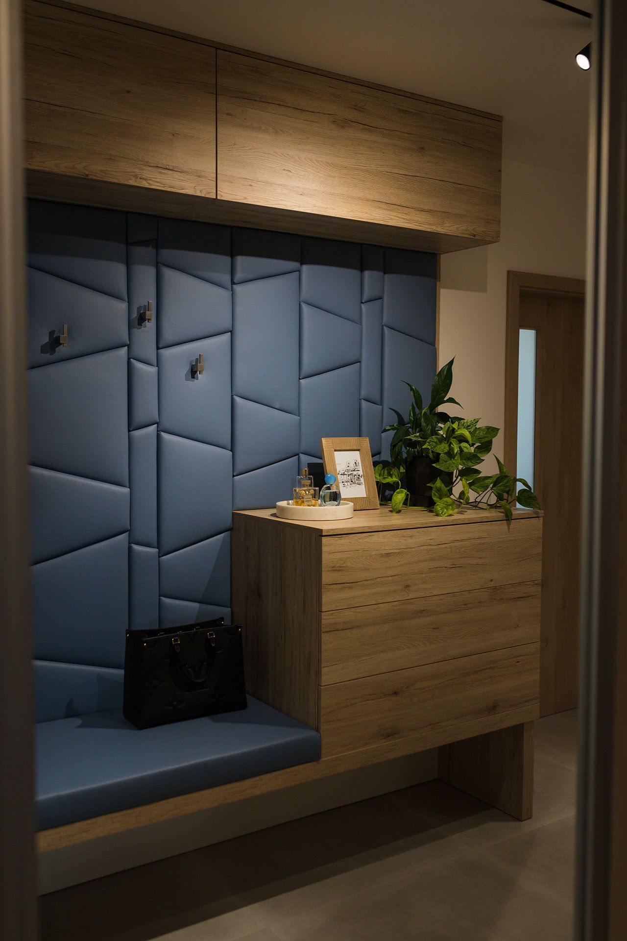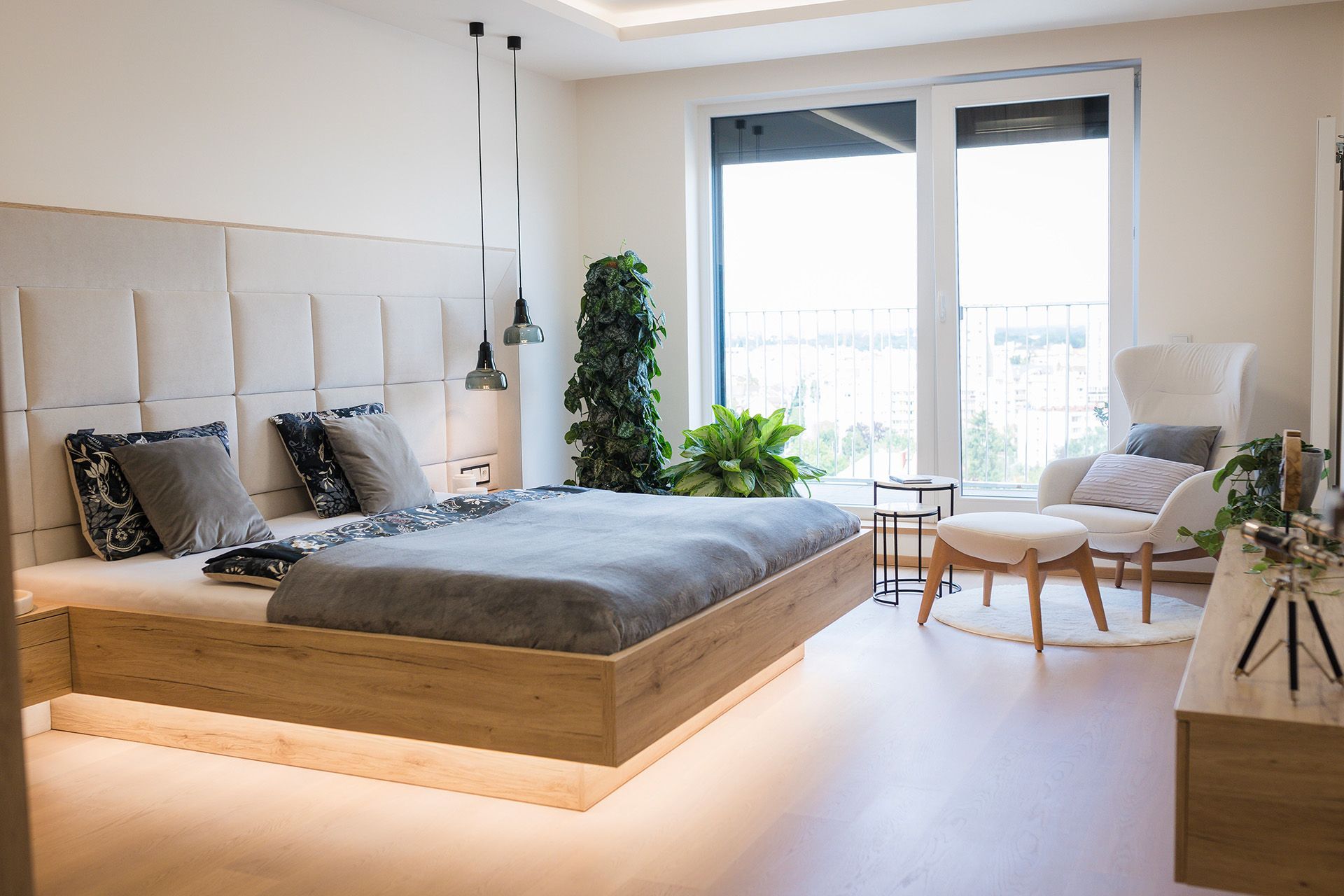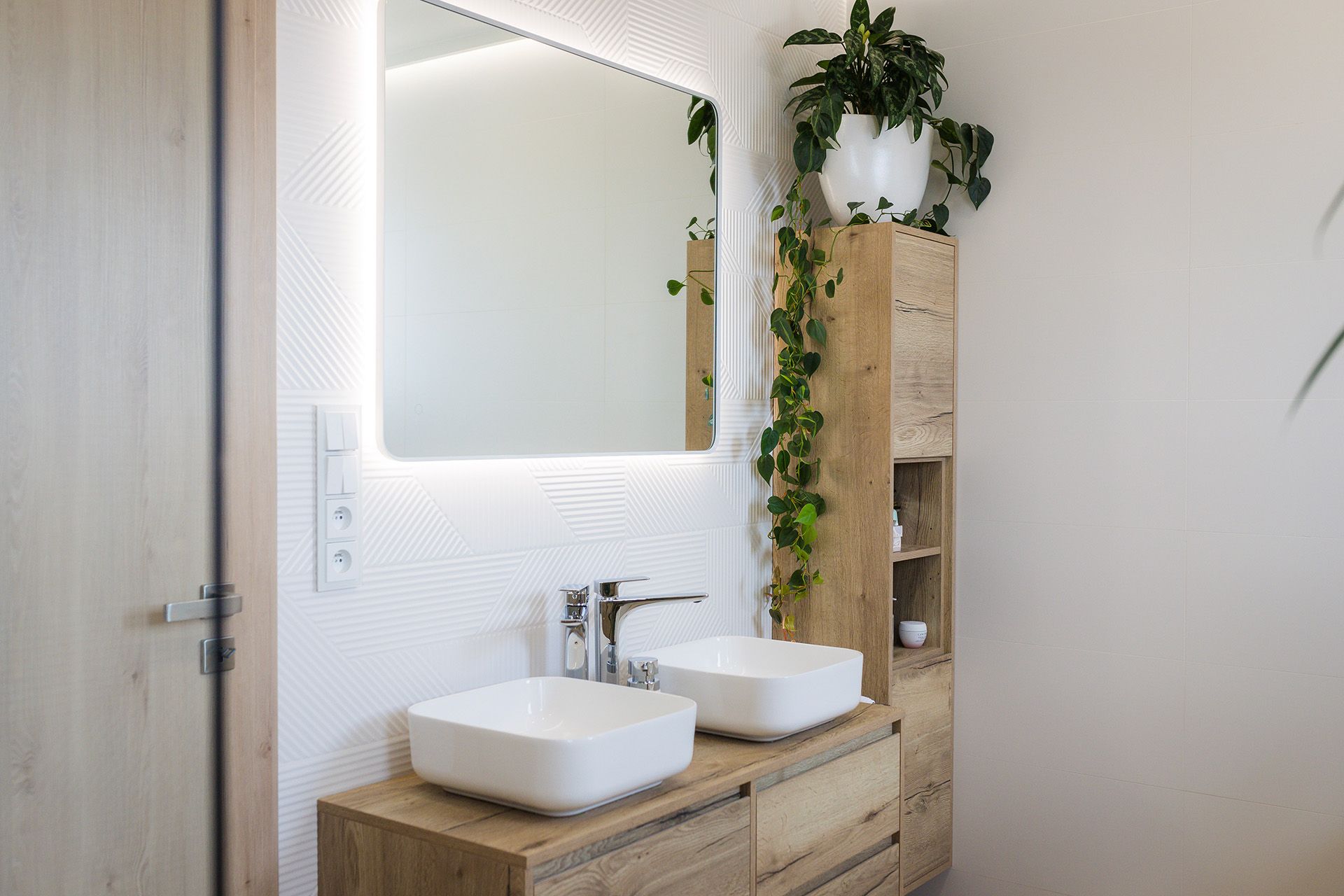 Ložnice je ztělesněním klidu – kombinace světlého čalouněného čela postele, závěsných lampiček a LED podsvícení vytváří pocit vznášení a jemného luxusu. Místnost doplňuje čtecí kout s pohodlným křeslem u francouzského okna a přirozeně působící zelení, která celému prostoru dodává život. Koupelny kombinují strukturované i hladké obklady, světlé a tmavé tóny, vždy však s důrazem na praktičnost a vizuální čistotu. Modulární nábytek z dřevodekoru, jednoduché bílé umyvadla, kulatá zrcadla a decentní armatury vytvářejí příjemně přehledný a funkční prostor. Také vstupní hala nezůstává pozadu – efektní čalouněné stěnové panely v modré barvě se tu potkávají s dubovým nábytkem a rafinovaným nasvícením, které z tohoto často opomíjeného prostoru dělají plnohodnotnou část interiéru.