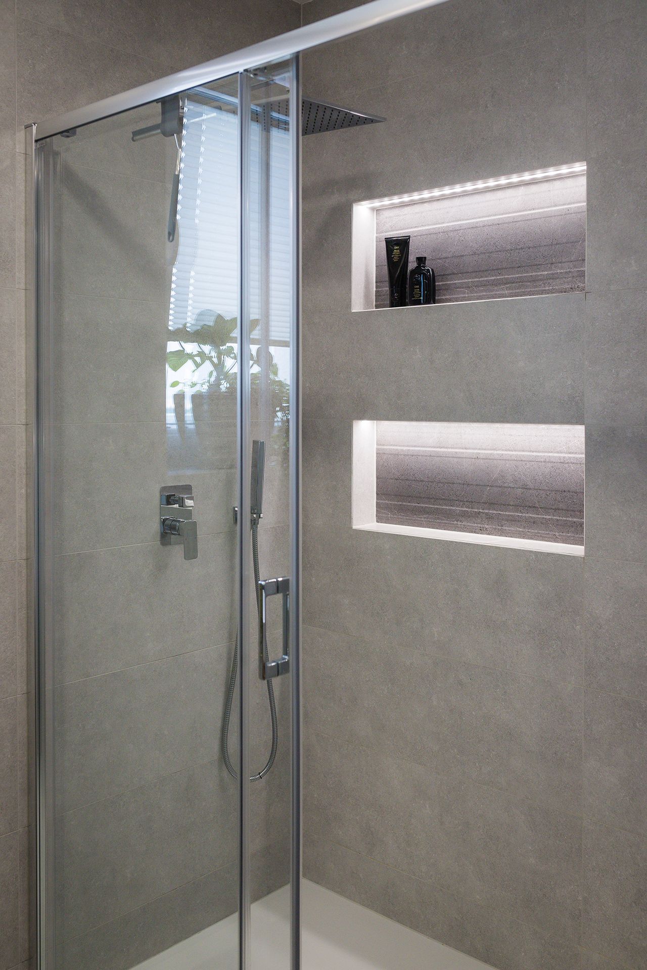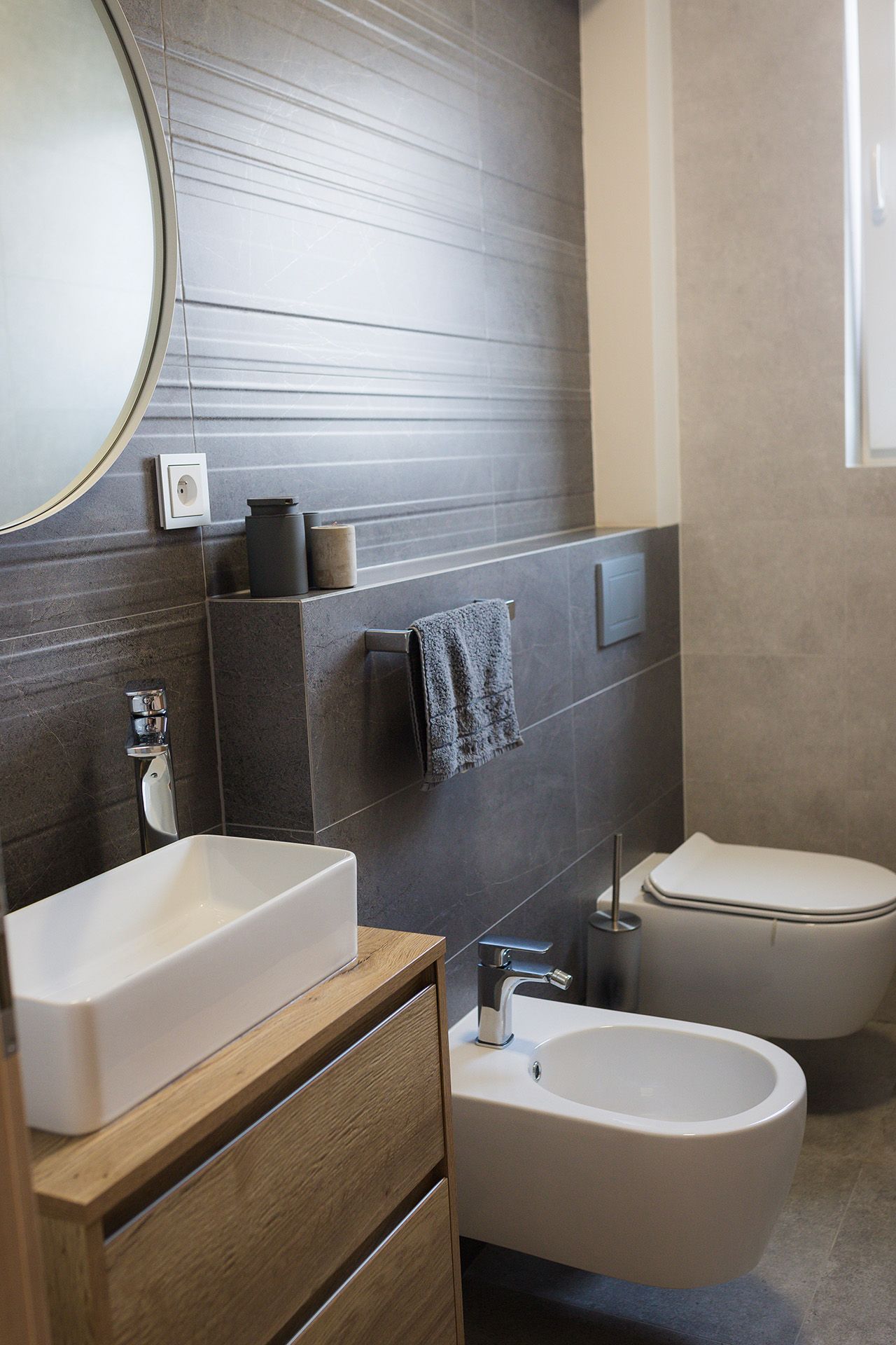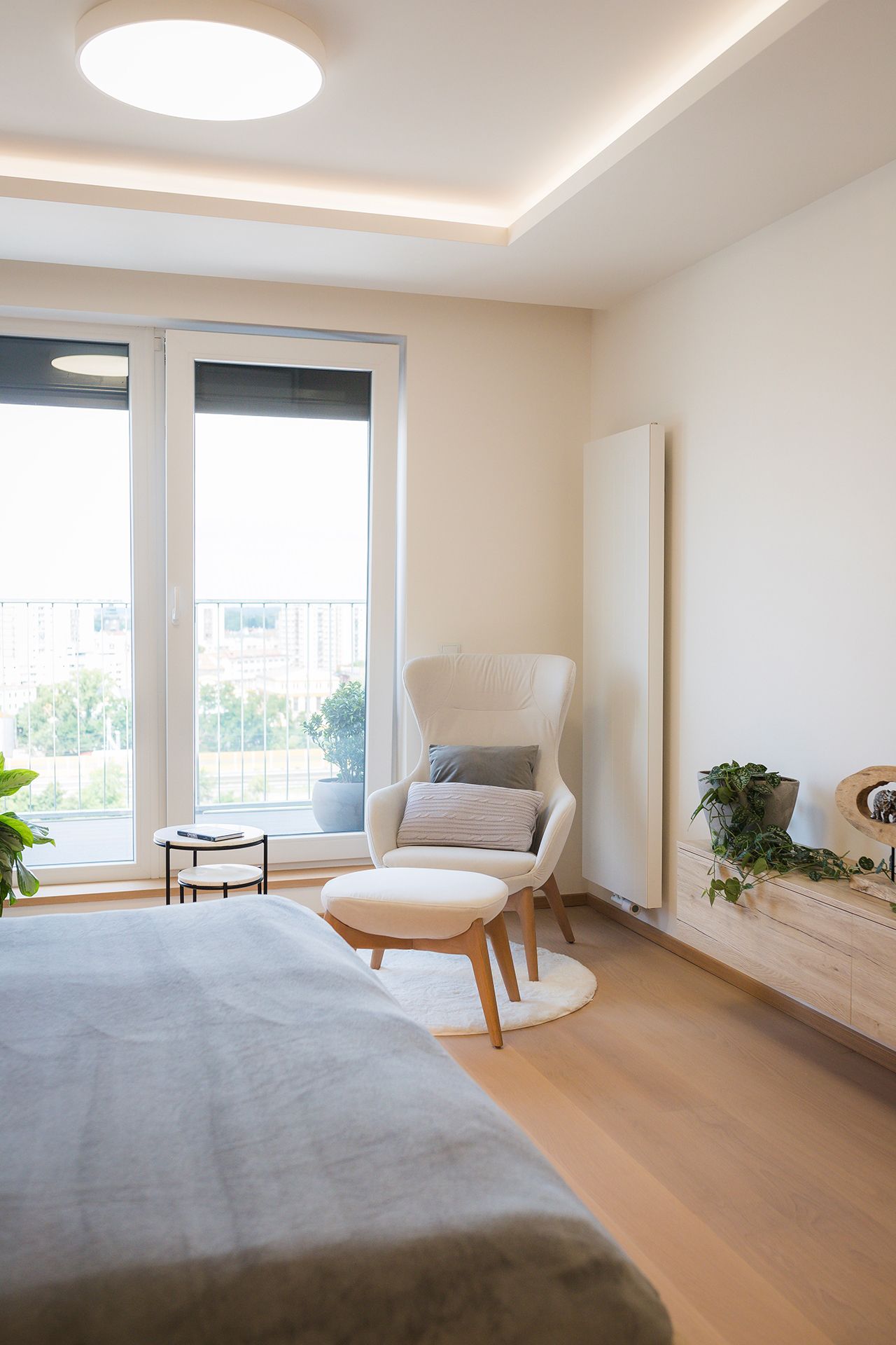 Ložnice je ztělesněním klidu – kombinace světlého čalouněného čela postele, závěsných lampiček a LED podsvícení vytváří pocit vznášení a jemného luxusu. Místnost doplňuje čtecí kout s pohodlným křeslem u francouzského okna a přirozeně působící zelení, která celému prostoru dodává život. Koupelny kombinují strukturované i hladké obklady, světlé a tmavé tóny, vždy však s důrazem na praktičnost a vizuální čistotu. Modulární nábytek z dřevodekoru, jednoduché bílé umyvadla, kulatá zrcadla a decentní armatury vytvářejí příjemně přehledný a funkční prostor. Také vstupní hala nezůstává pozadu – efektní čalouněné stěnové panely v modré barvě se tu potkávají s dubovým nábytkem a rafinovaným nasvícením, které z tohoto často opomíjeného prostoru dělají plnohodnotnou část interiéru.