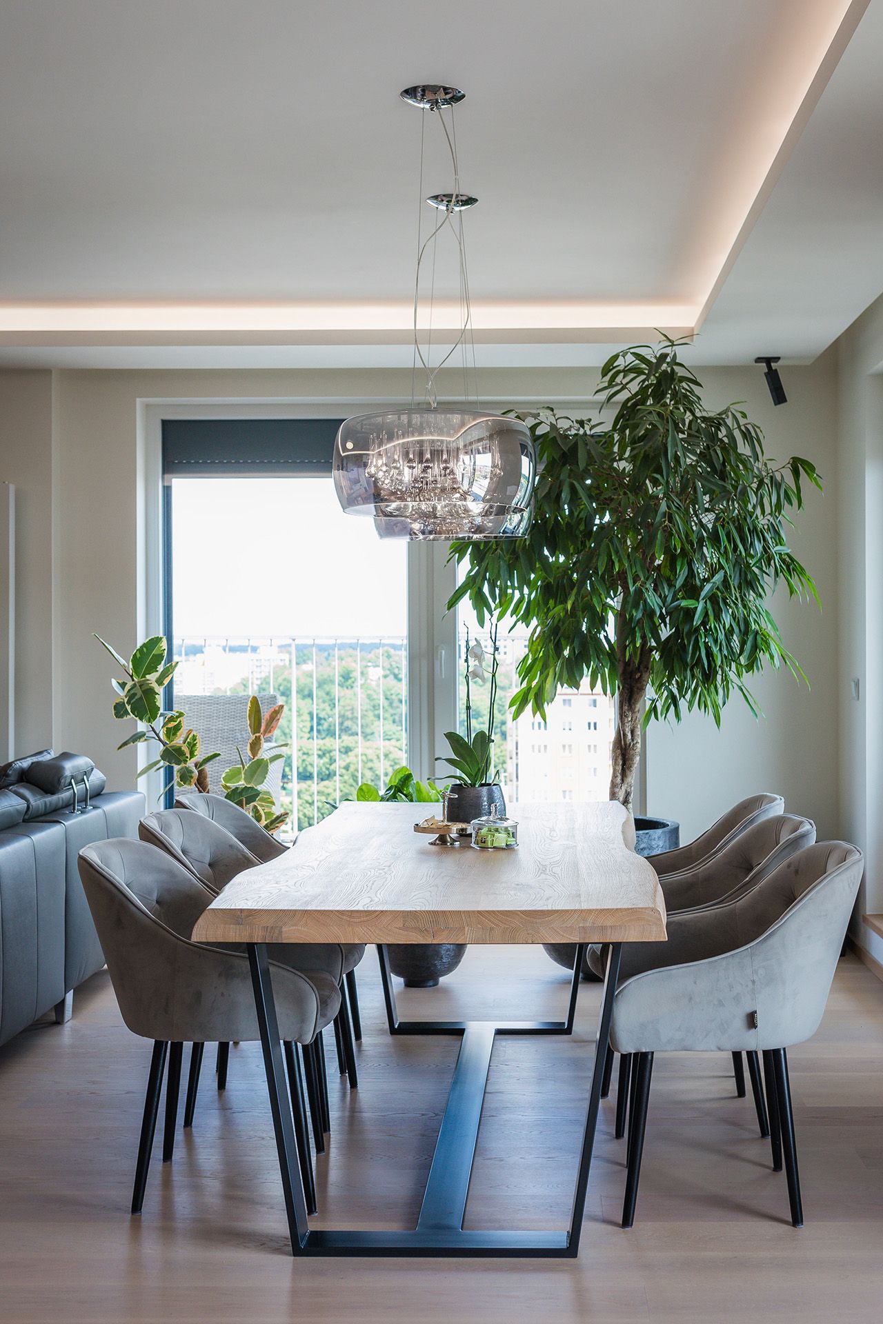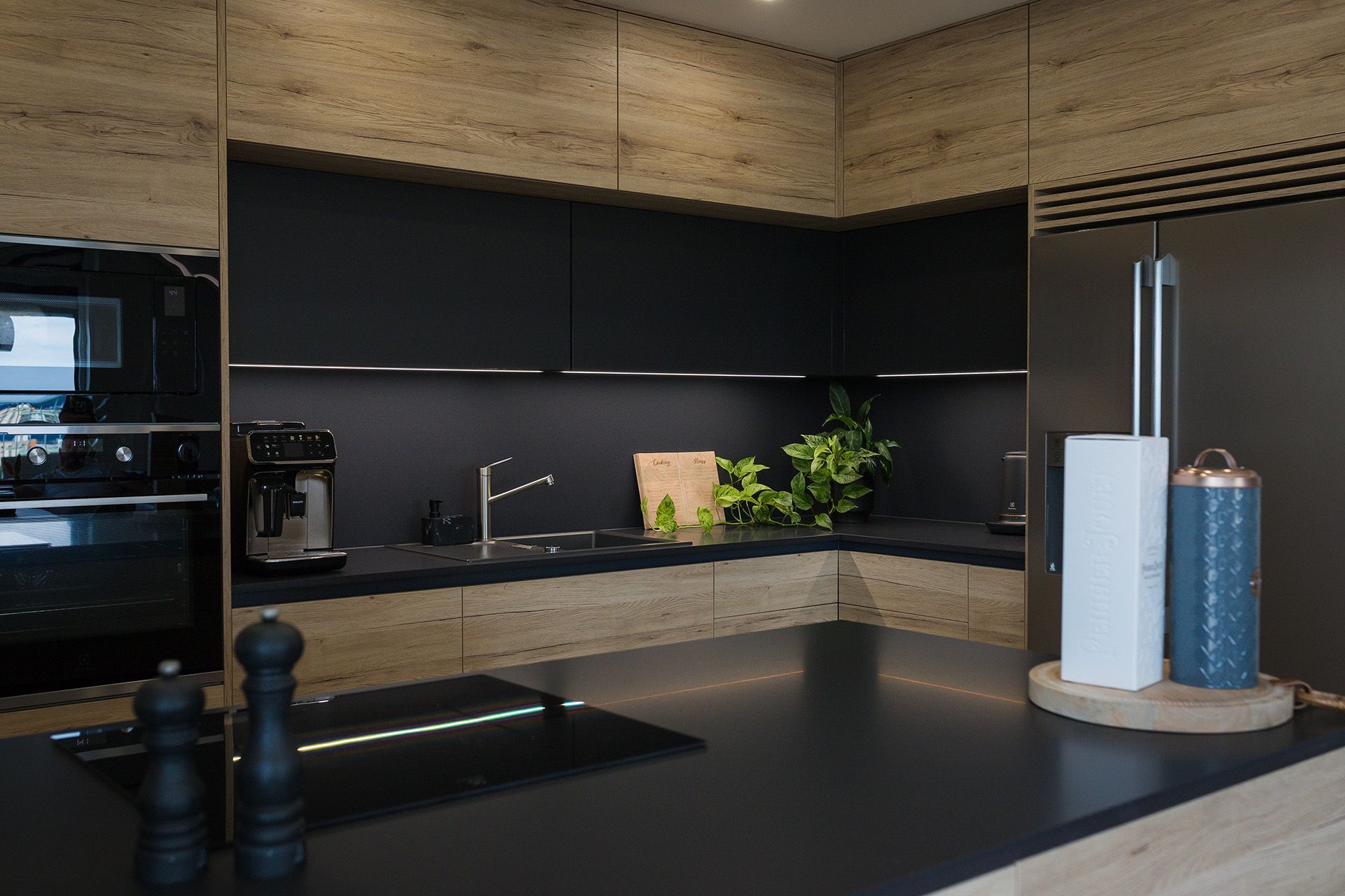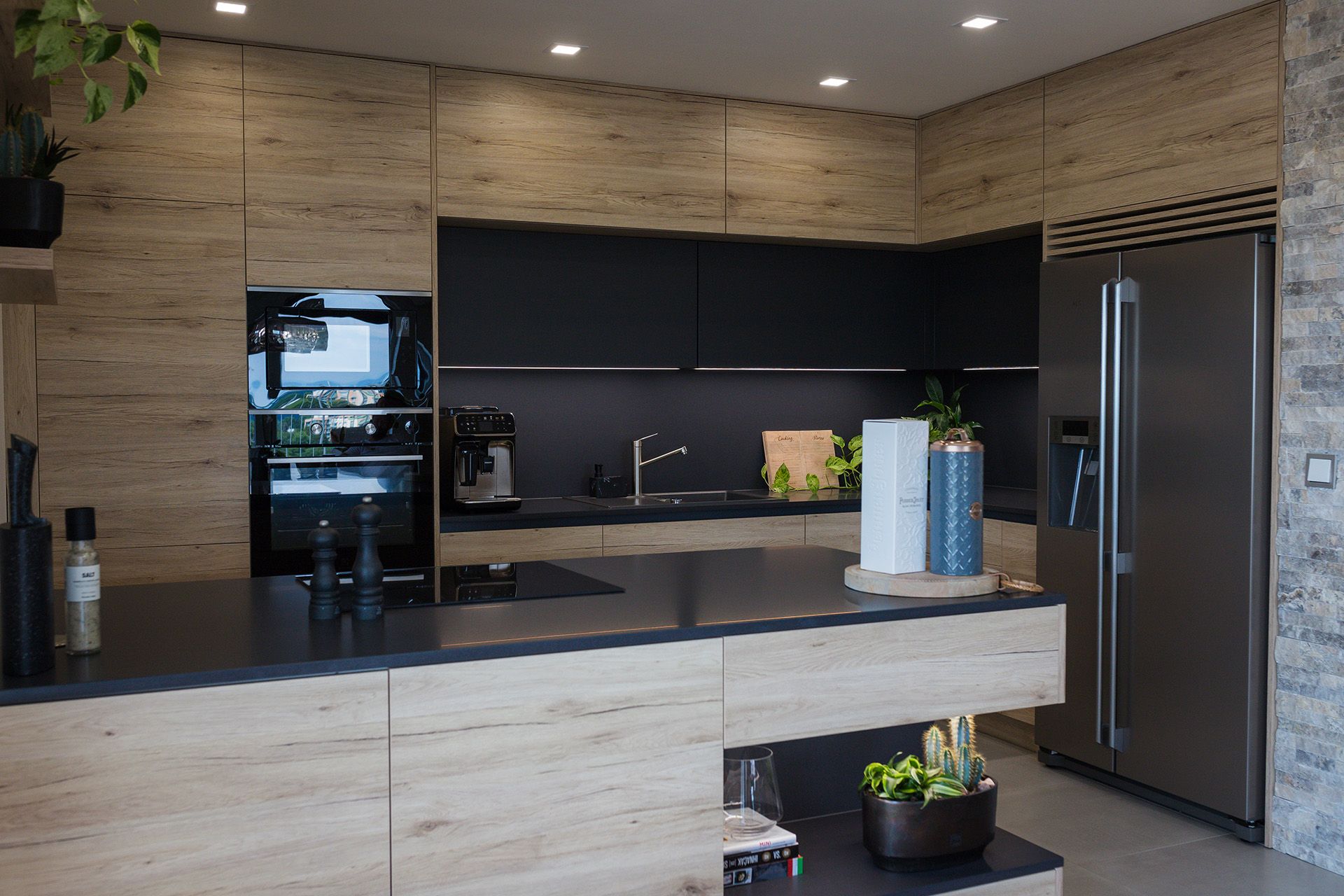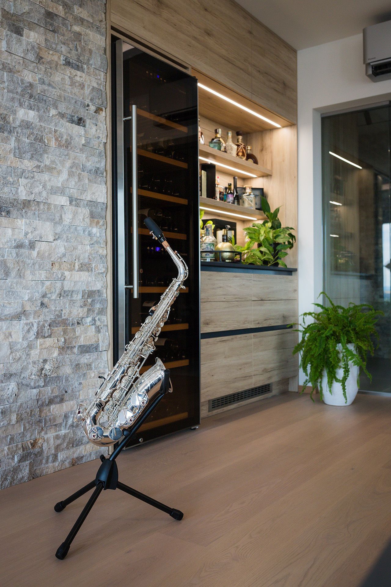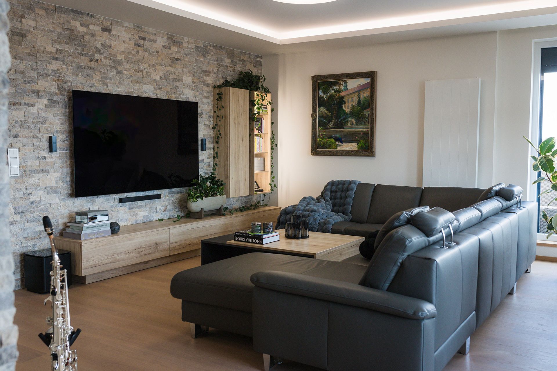 Dominantou společenské části bytu je velkorysý obývací pokoj, propojený s jídelnou a kuchyní v jednotném tónu přírodního dřeva, černé a šedé. Nadčasová kuchyně s tmavými plochami a bezúchytkovým řešením vytváří čistý, funkční prostor s dostatkem úložných možností a důmyslným osvětlením. Masivní jídelní stůl z přírodního dubu v kombinaci s šedými čalouněnými židlemi a impozantním světlem zavěšeným nad ním působí jako srdce celého bytu. Obývací část laděná do tmavších tónů působí klidně a stabilně – kamenný obklad, šedá rohová sedačka a decentní doplňky v podobě rostlin a umění vytvářejí příjemné zázemí pro relaxaci i setkávání. Detaily jako vinotéka, saxofon nebo knihy na konferenčním stolku ukazují, že se tu nejen žije, ale i tvoří.