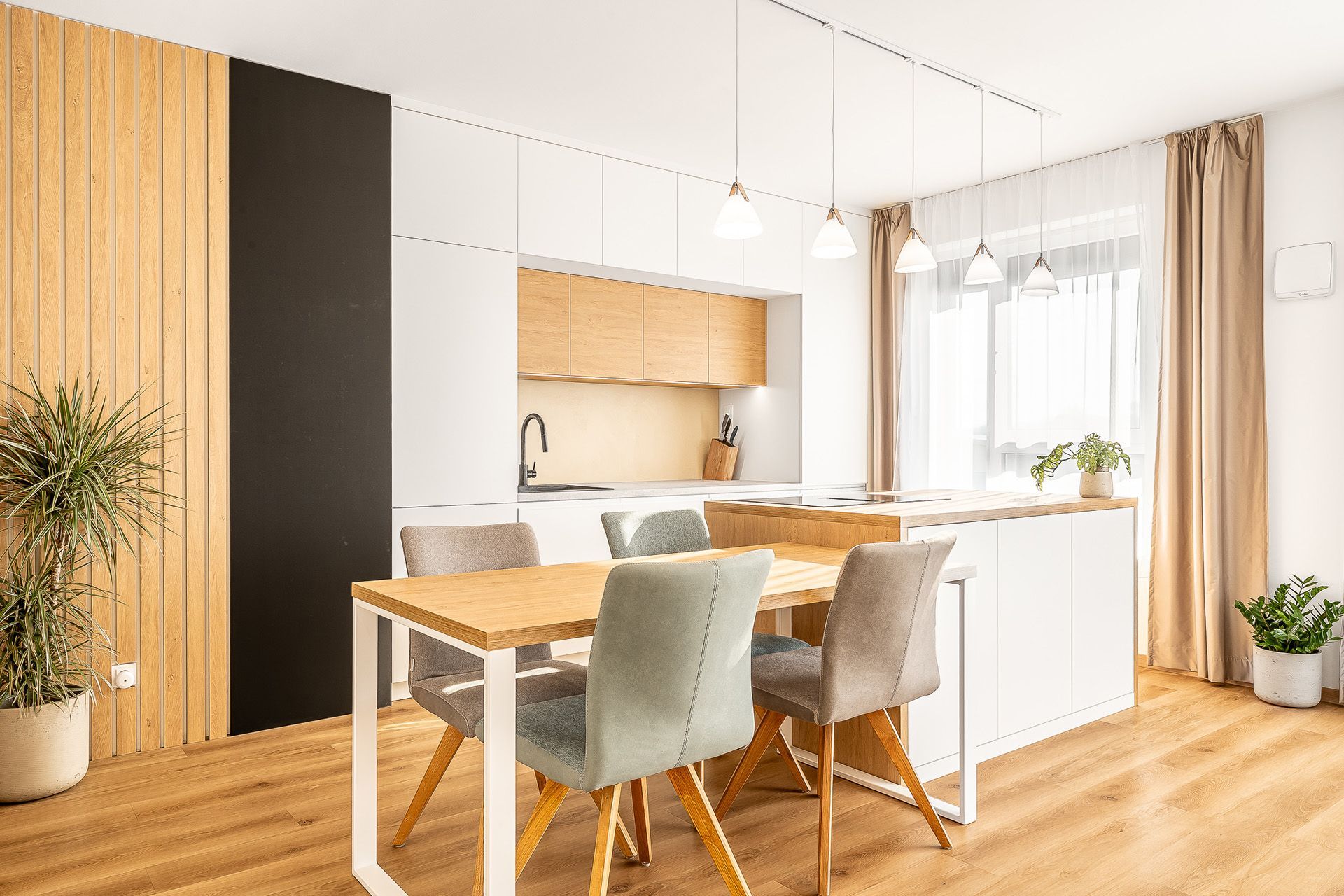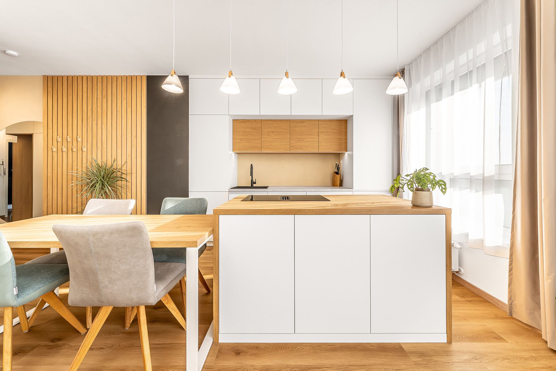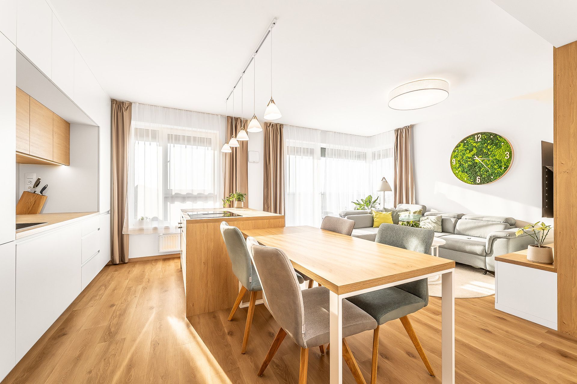 Denní část bytu působí svěže a otevřeně – světlo proudící z velkých oken se odráží od bílých ploch a světlého dřeva, čímž celý prostor vizuálně zvětšuje. Kuchyň s jídelním stolem tvoří jeden plynulý celek, kde převažuje funkčnost, ale nic není ponecháno náhodě – každý detail ladí s ostatními. Zemité odstíny, pastelové židle, světlé záclony a jemné dekory stěn tvoří vizuálně uklidňující rámec každodenního fungování. Dřevěné obklady, kuchyňský ostrůvek i elegantní osvětlení vytvářejí kombinaci, která působí domácky, přesto však současně velmi moderně.