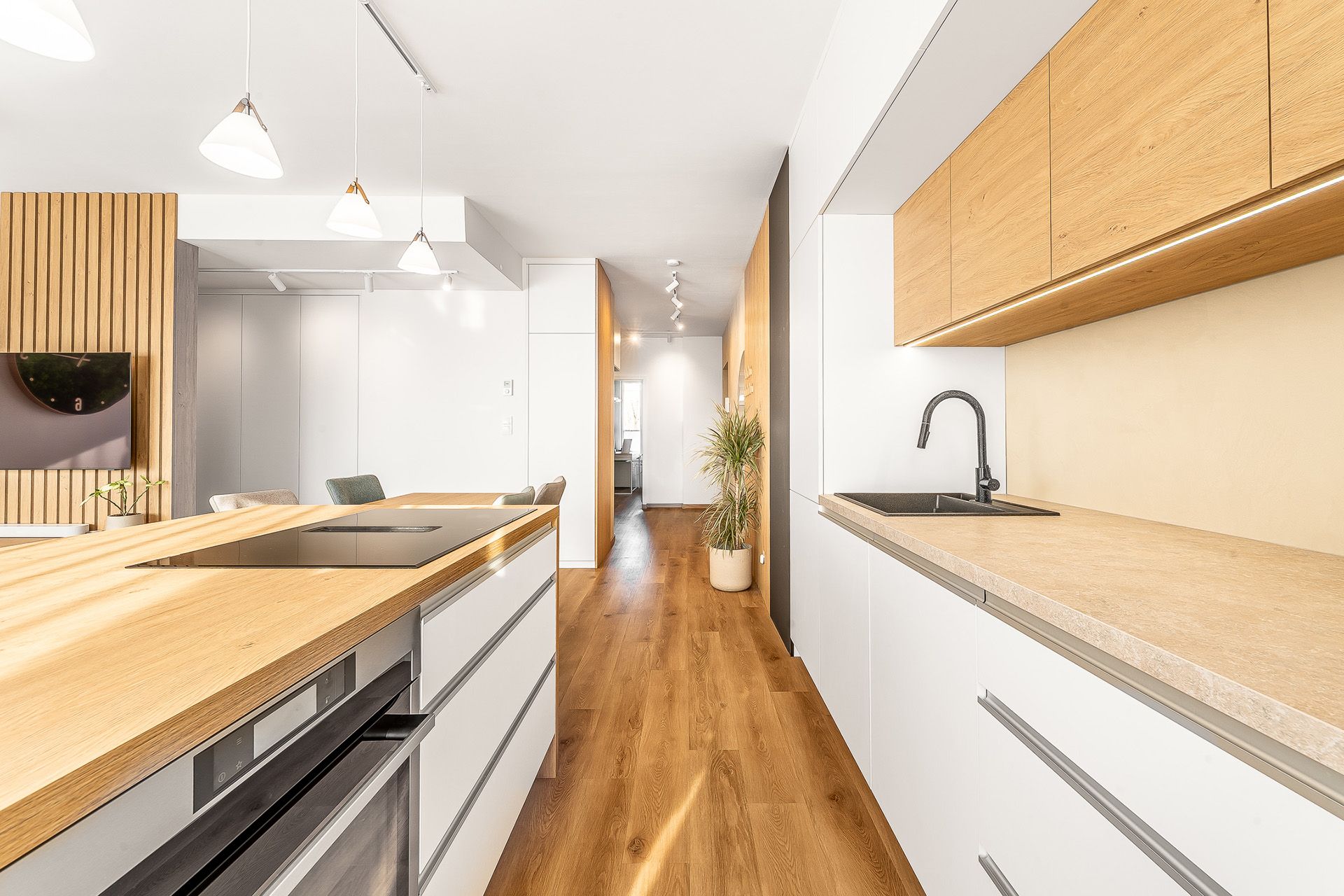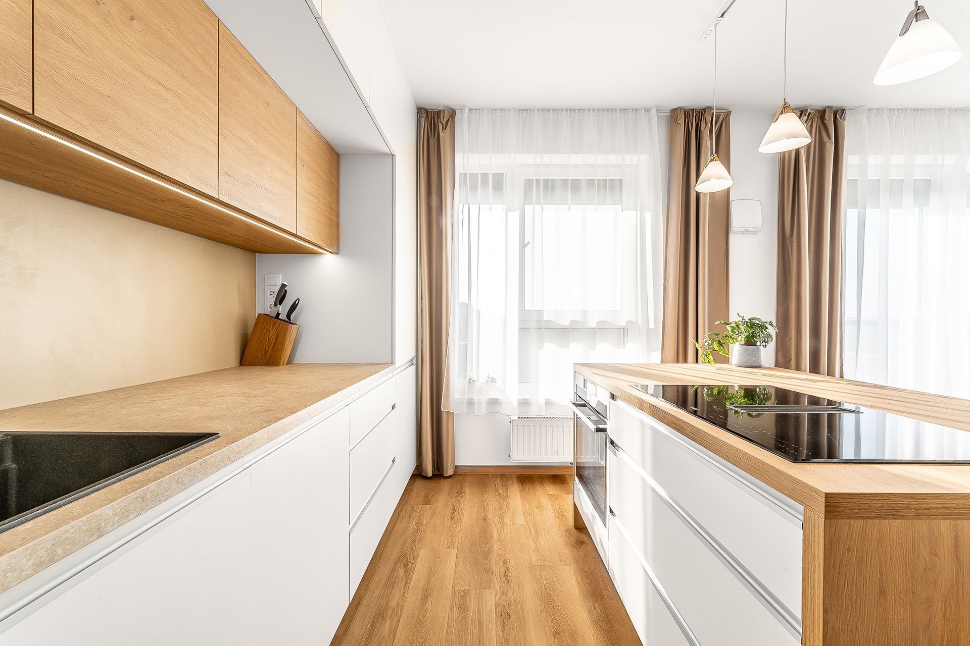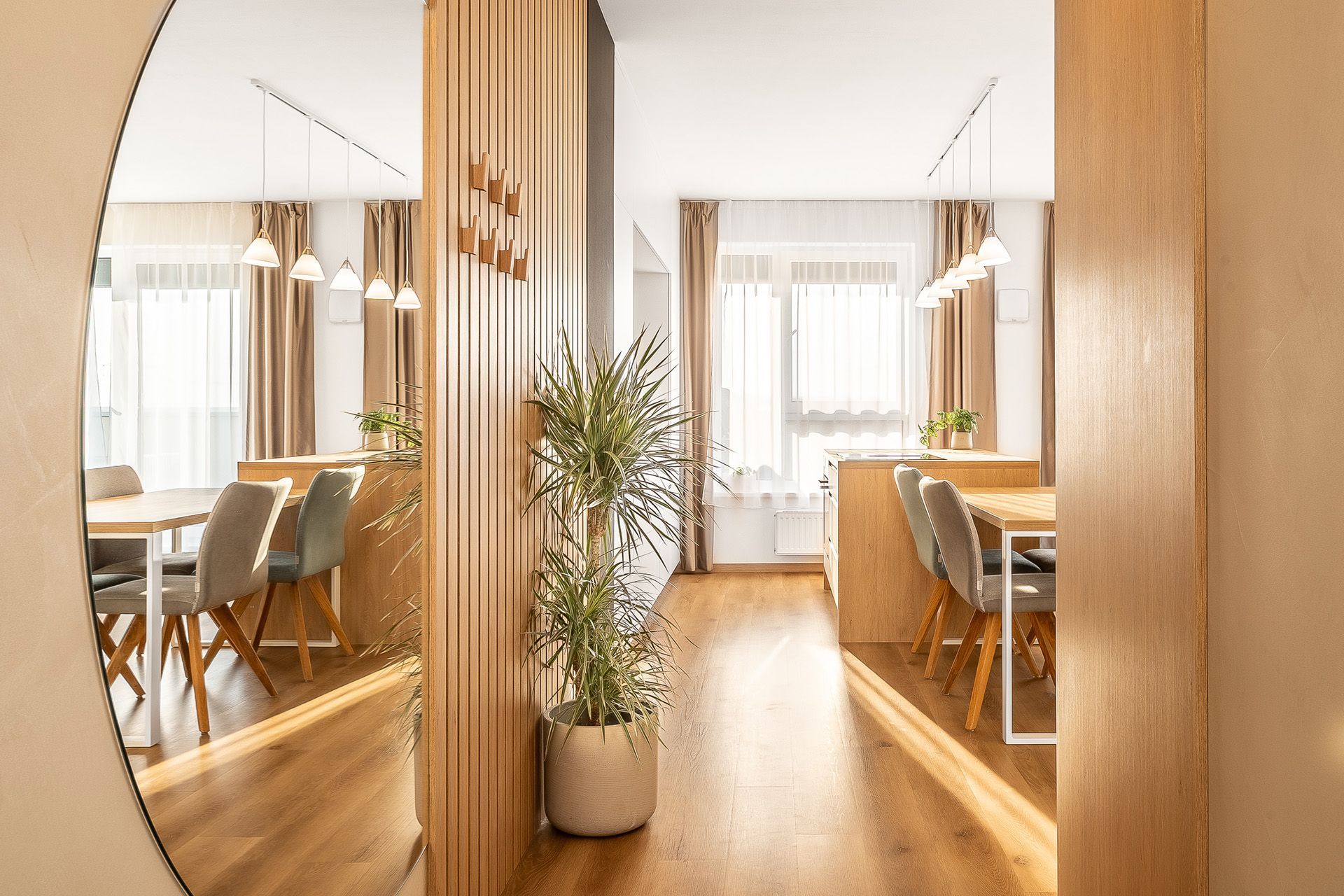 Denní část bytu působí svěže a otevřeně – světlo proudící z velkých oken se odráží od bílých ploch a světlého dřeva, čímž celý prostor vizuálně zvětšuje. Kuchyň s jídelním stolem tvoří jeden plynulý celek, kde převažuje funkčnost, ale nic není ponecháno náhodě – každý detail ladí s ostatními. Zemité odstíny, pastelové židle, světlé záclony a jemné dekory stěn tvoří vizuálně uklidňující rámec každodenního fungování. Dřevěné obklady, kuchyňský ostrůvek i elegantní osvětlení vytvářejí kombinaci, která působí domácky, přesto však současně velmi moderně.