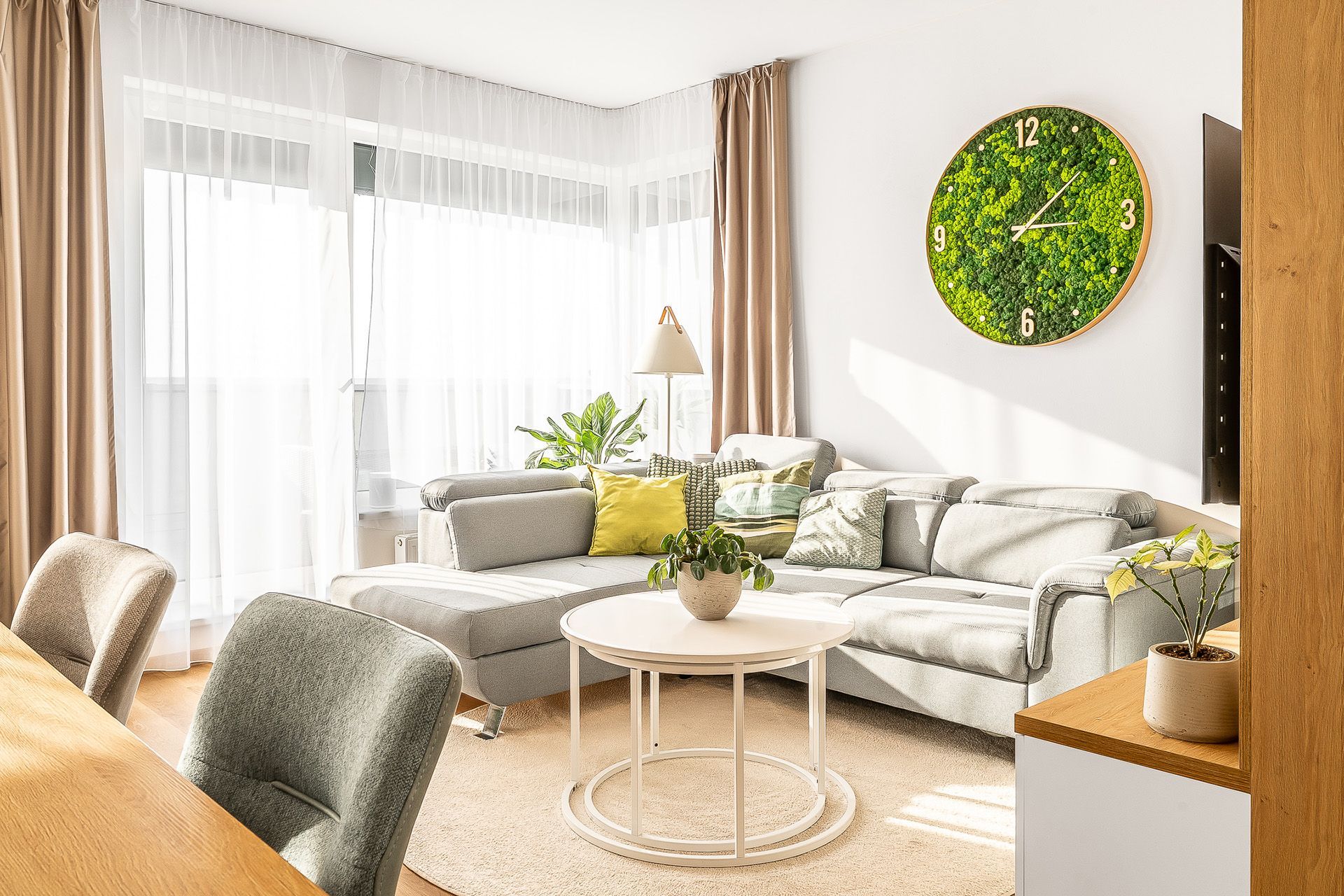 Obývací část plynule navazuje na jídelnu, ale díky kusovému koberci, kulatému stolku a ladění do béžova působí ještě měkčeji. Pohovka ve světle šedé barvě nabízí nejen pohodlí, ale i vizuální středobod celé místnosti. Zeleň v květináčích a výrazné hodiny z mechového porostu dodávají interiéru hravý i přírodní akcent. Celkový design je ukázkou precizní práce s barvami, materiály i dispozicí. Byt působí čistě, harmonicky a přívětivě – ideální pro každodenní život, odpočinek i tichou inspiraci.