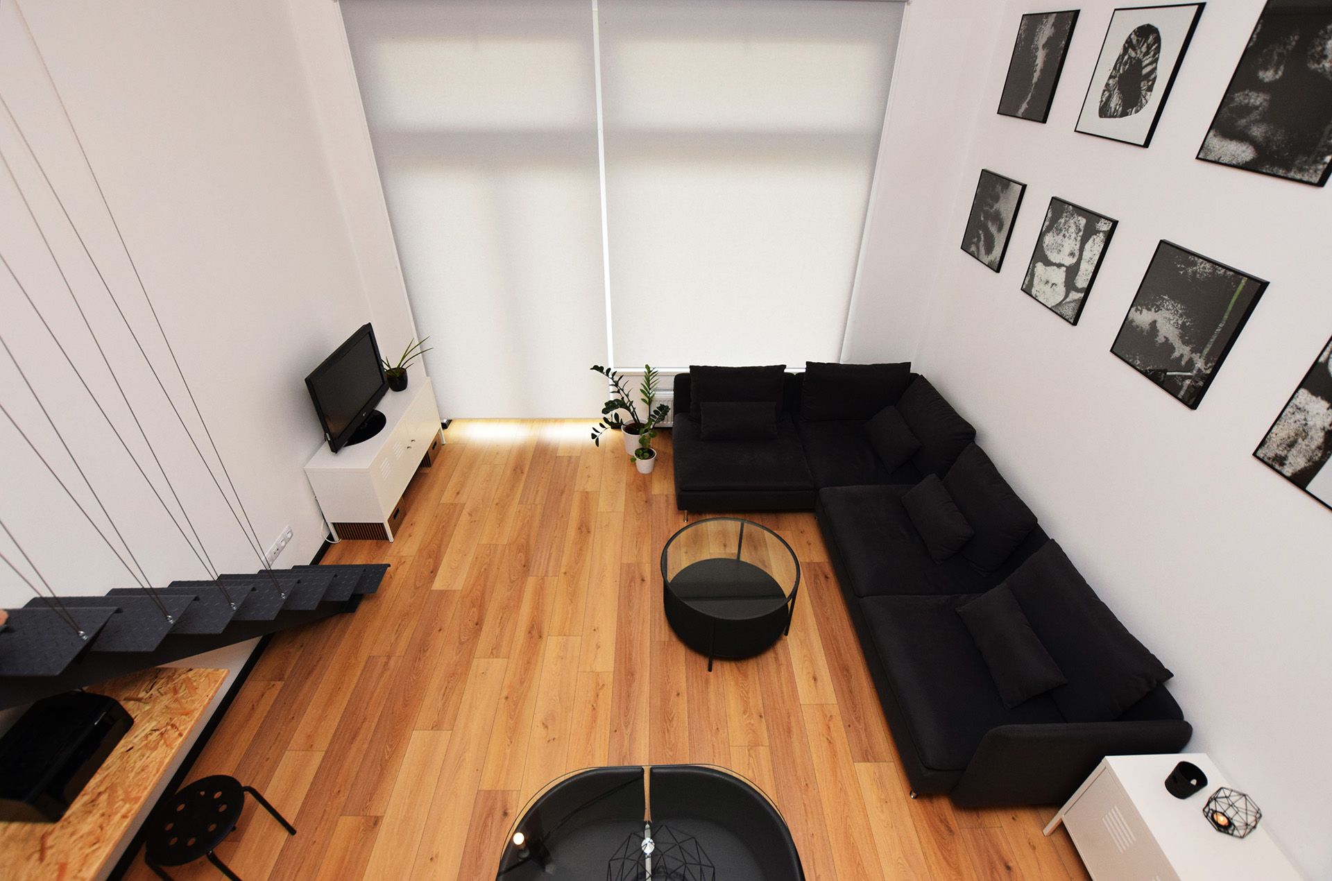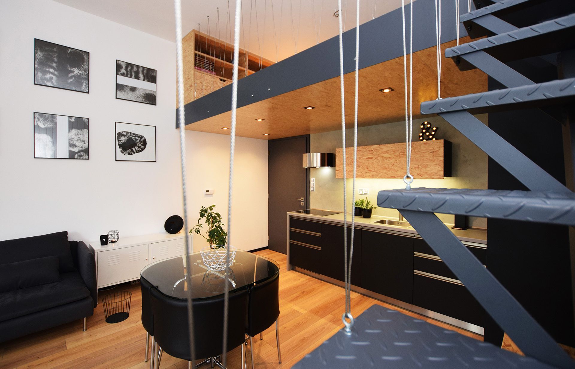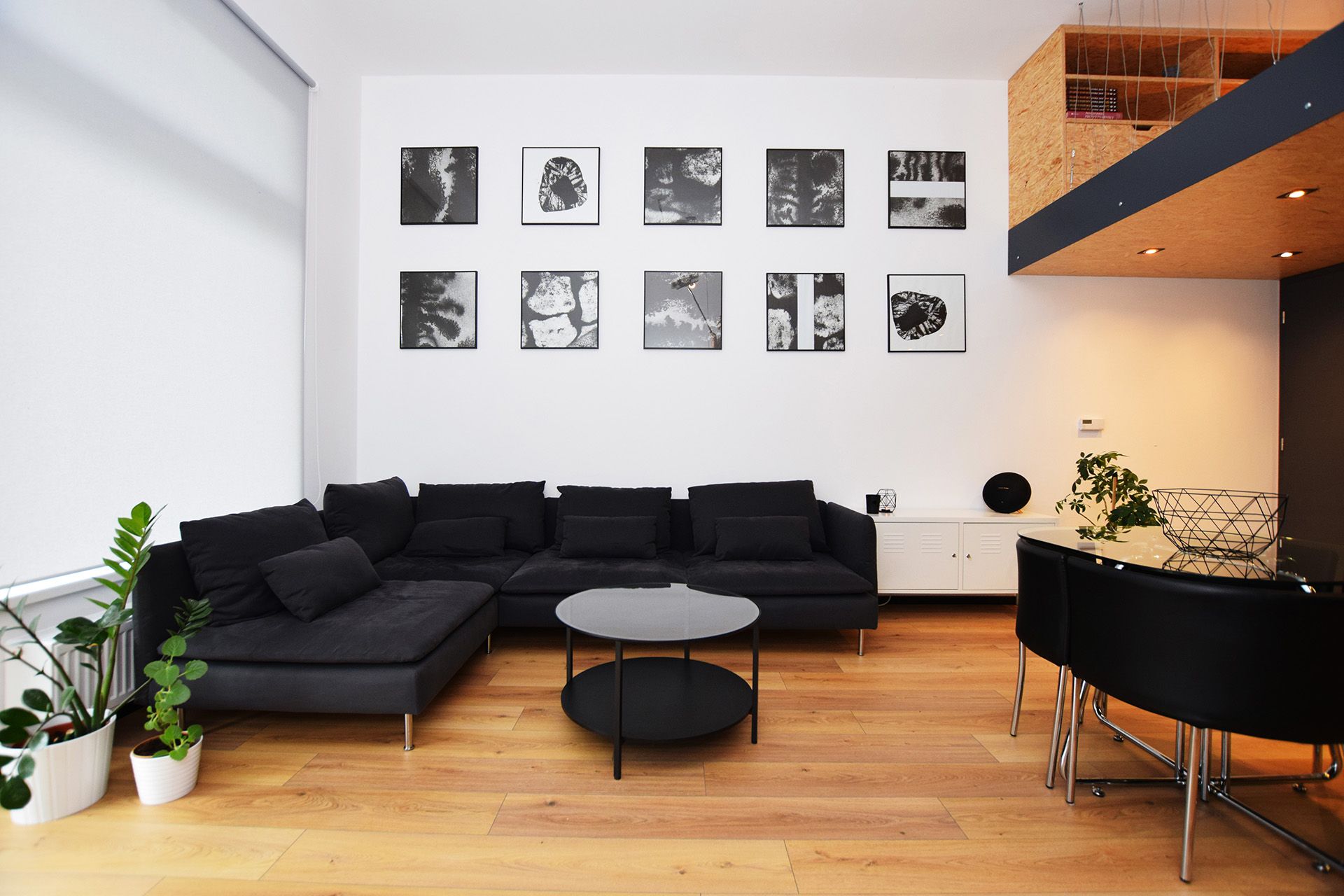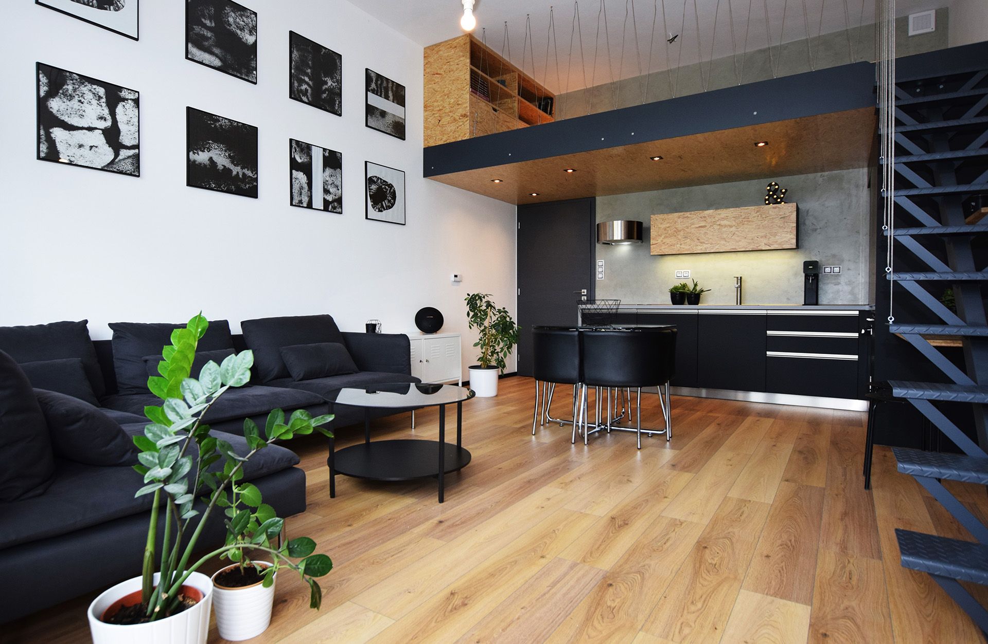 Velkorysá světlá výška prostoru umožnila odlehčené patro, které vizuálně neubírá na vzdušnosti. Dominantní černá pohovka v kontrastu s bílými stěnami a geometrickými obrazy vytváří stylový rámec pro odpočinek. Celá stěna je věnována jednoduché, černobílé grafice, která interiéru dodává galerijní nádech. Přírodní dřevěná podlaha prostor zjemňuje a přivádí do něj teplo. Čisté linie nábytku, minimum dekorací a důraz na volný prostor zdůrazňují industriální charakter celku.
