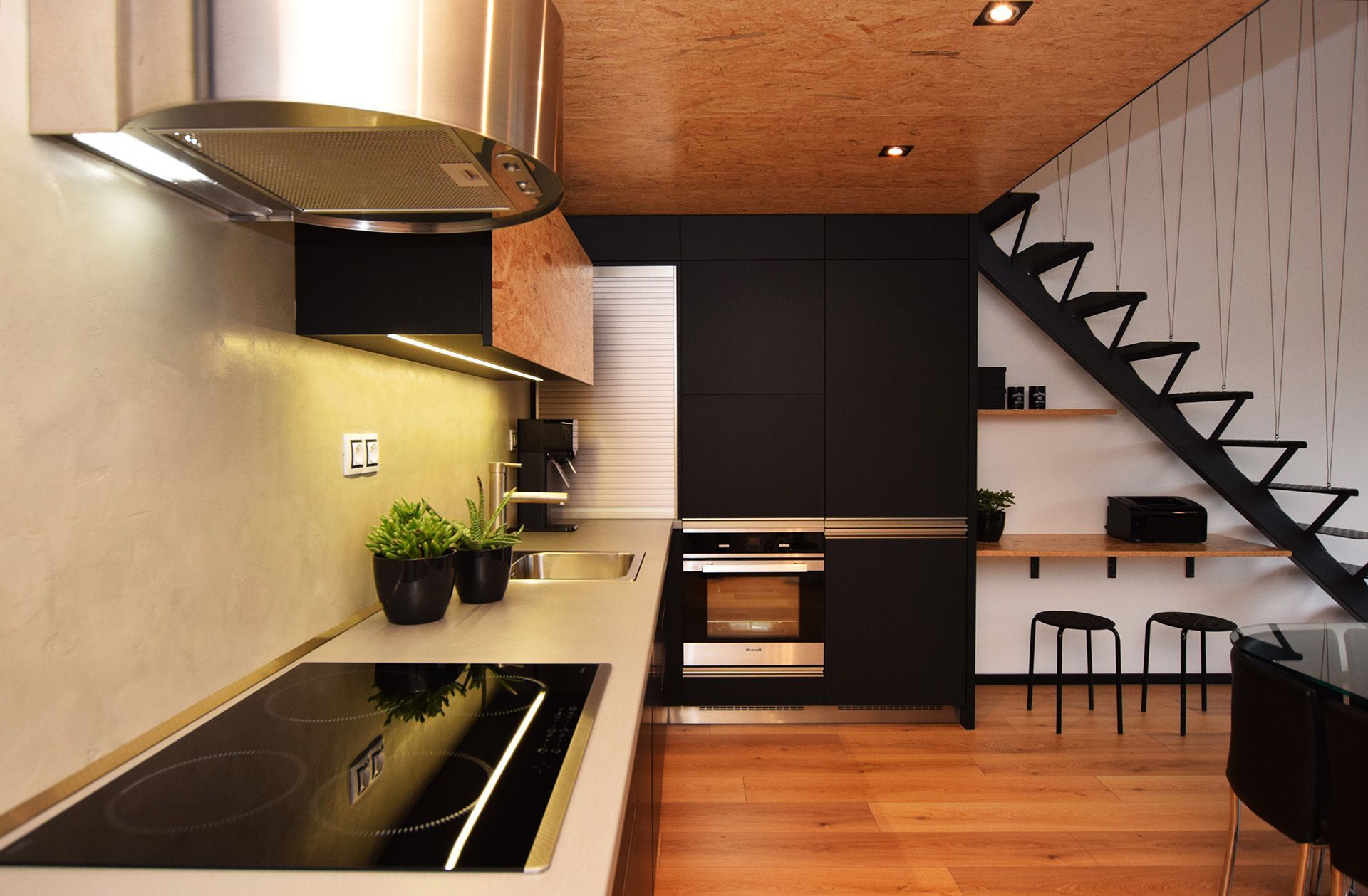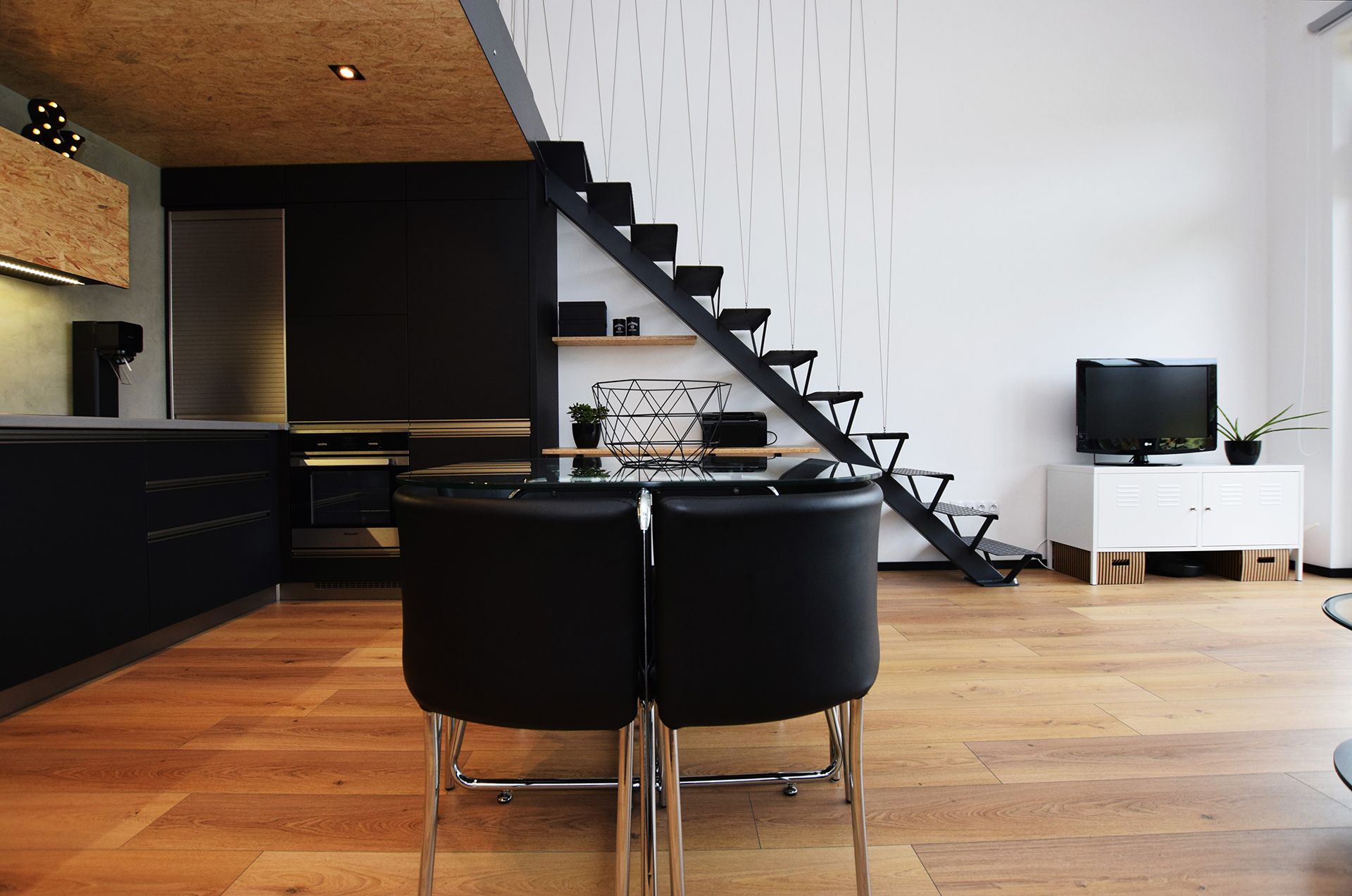 Kuchyňská linka v matně černé barvě je zasazená pod patro, jehož strop je z pohledové OSB desky – materiálu, který se opakuje i na horních skříňkách a desce pracovního stolu. Šedá stěrka na stěně propojuje kuchyň se zbytkem interiéru a tvoří příjemné pozadí pro minimalistické vybavení. Nerezové detaily a linkové osvětlení dodávají kuchyni praktický a současný výraz. Navazující jídelní část se skleněným stolem a černými židlemi je prostorově úsporná, přesto komfortní. Pod schodištěm do patra je chytře využitý prostor pro pracovní kout s jednoduchým stolkem a regálem – funkčně oddělený, ale stále součástí celku. Vrchní patro je určeno ke spaní, podobně je vložené spací patro i ve vedlejším dětském pokoji.
