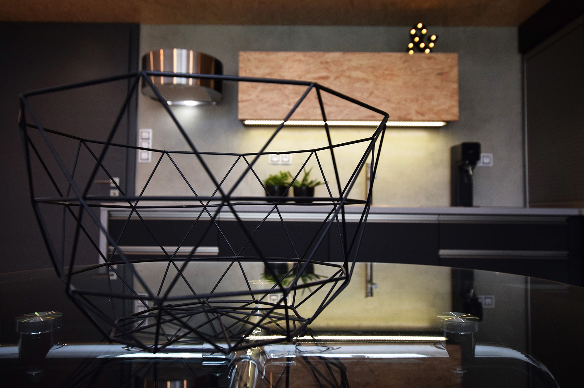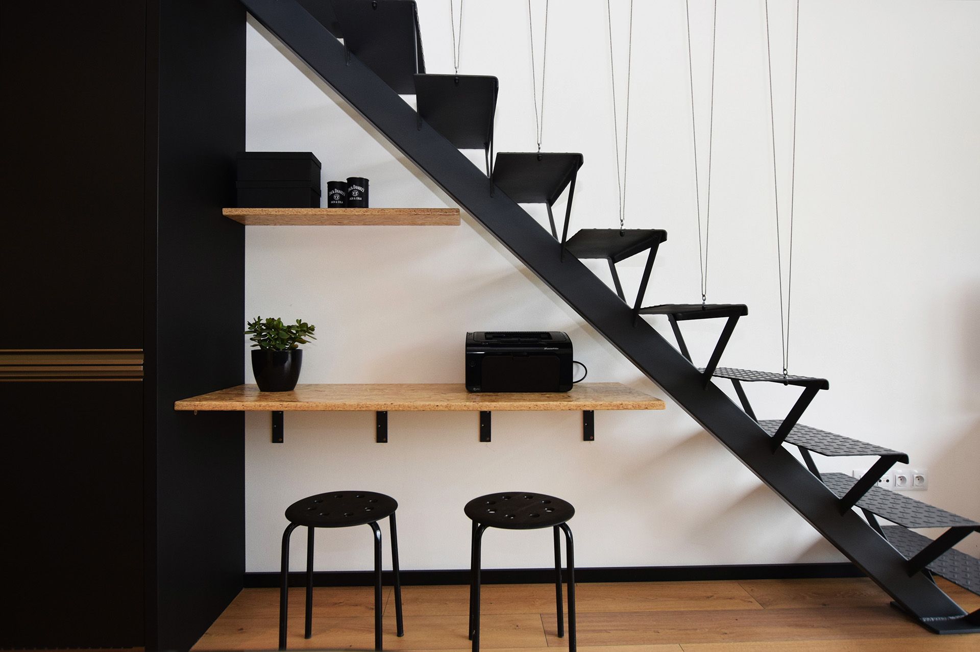 Minimalistický interiér s industriálními prvky, kde se propojují černá, dřevo a surové materiály v jeden promyšlený celek.