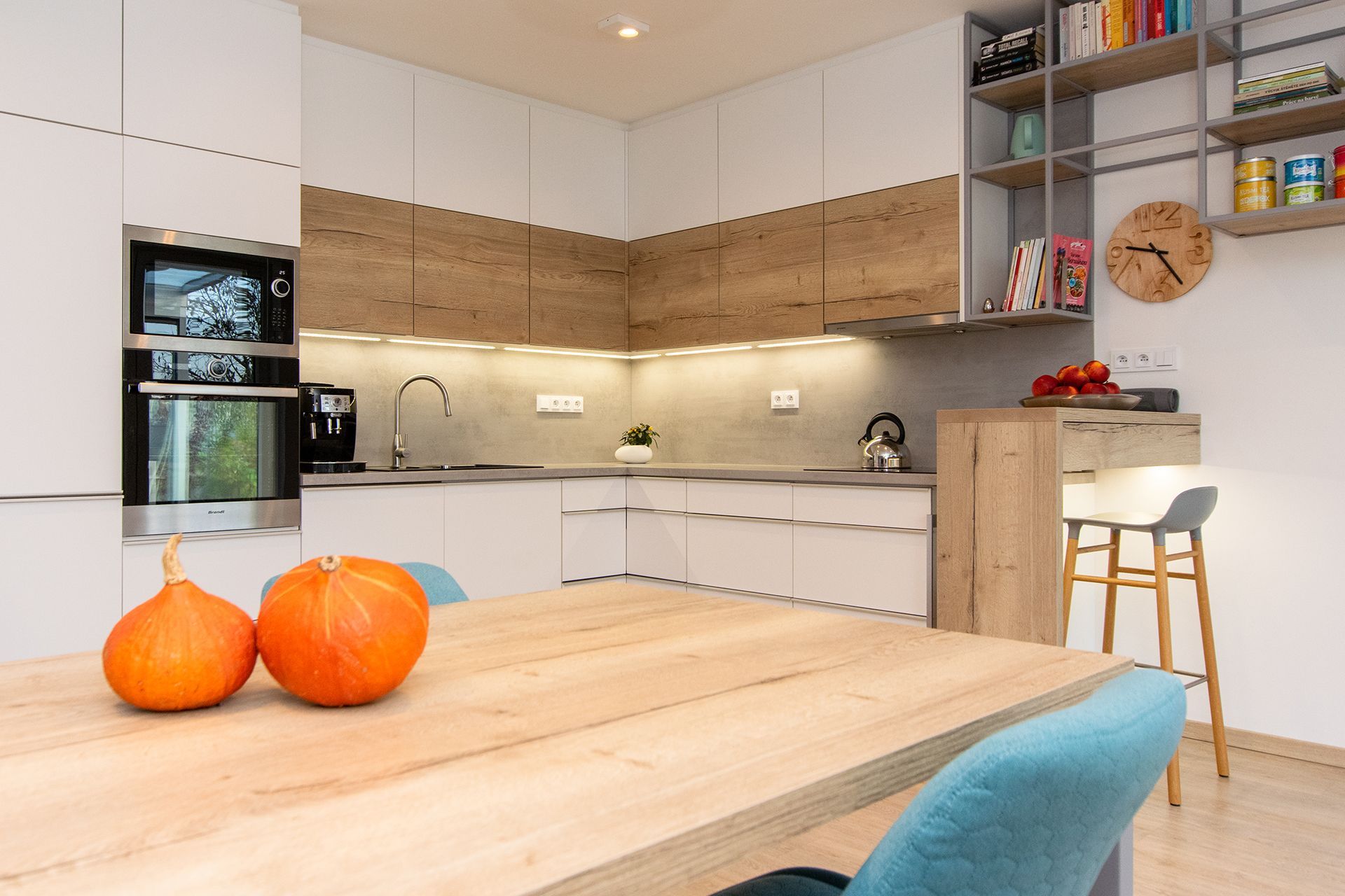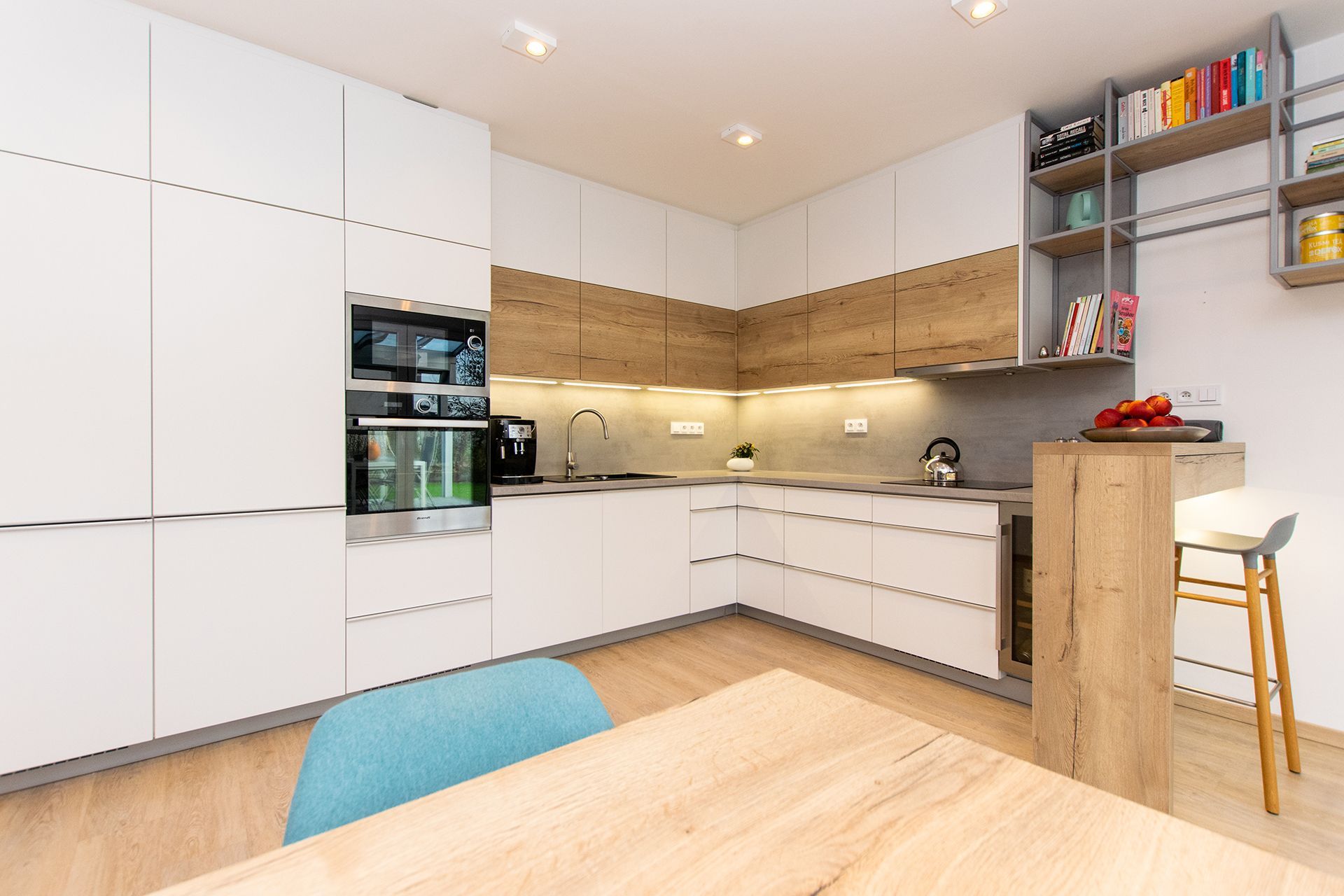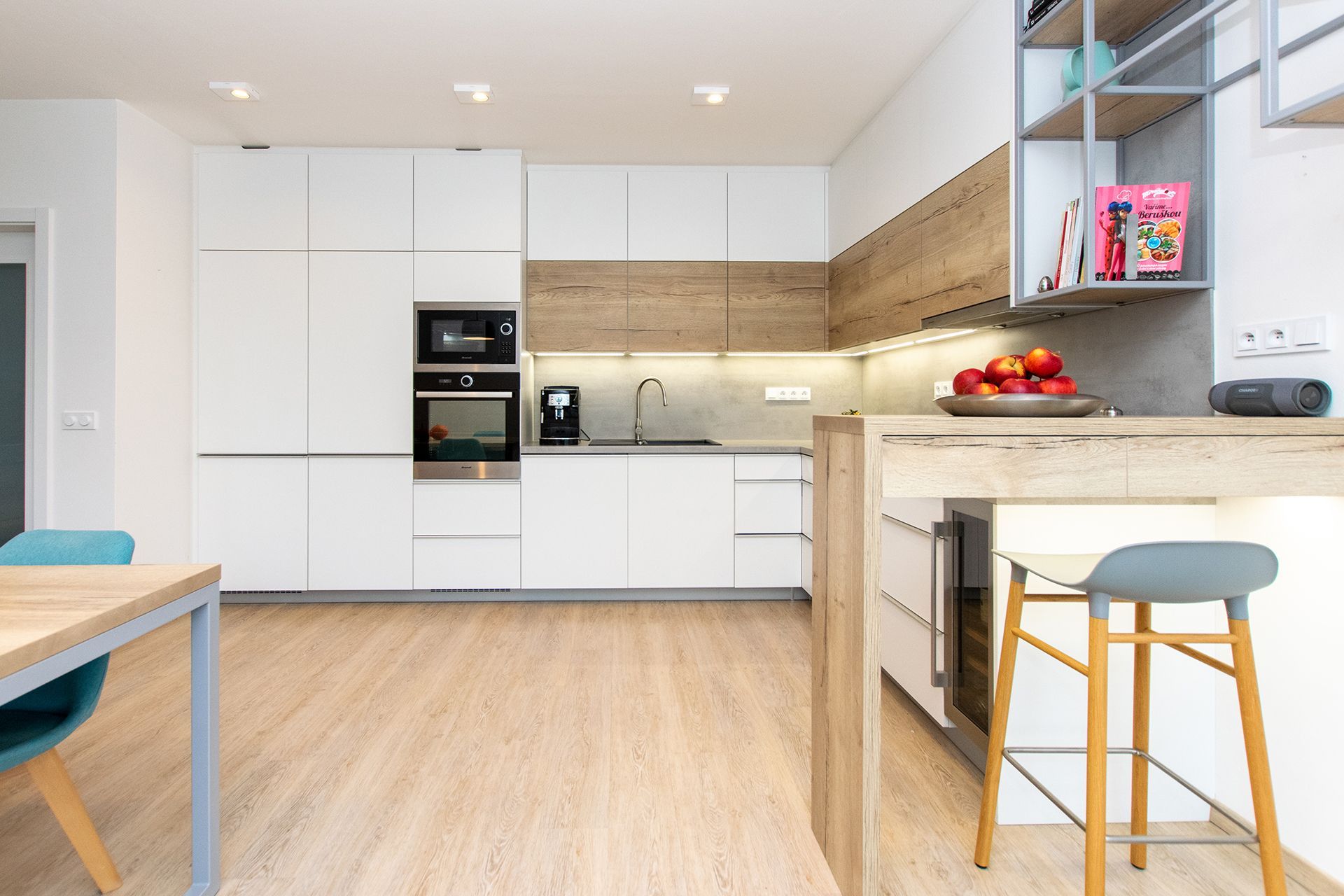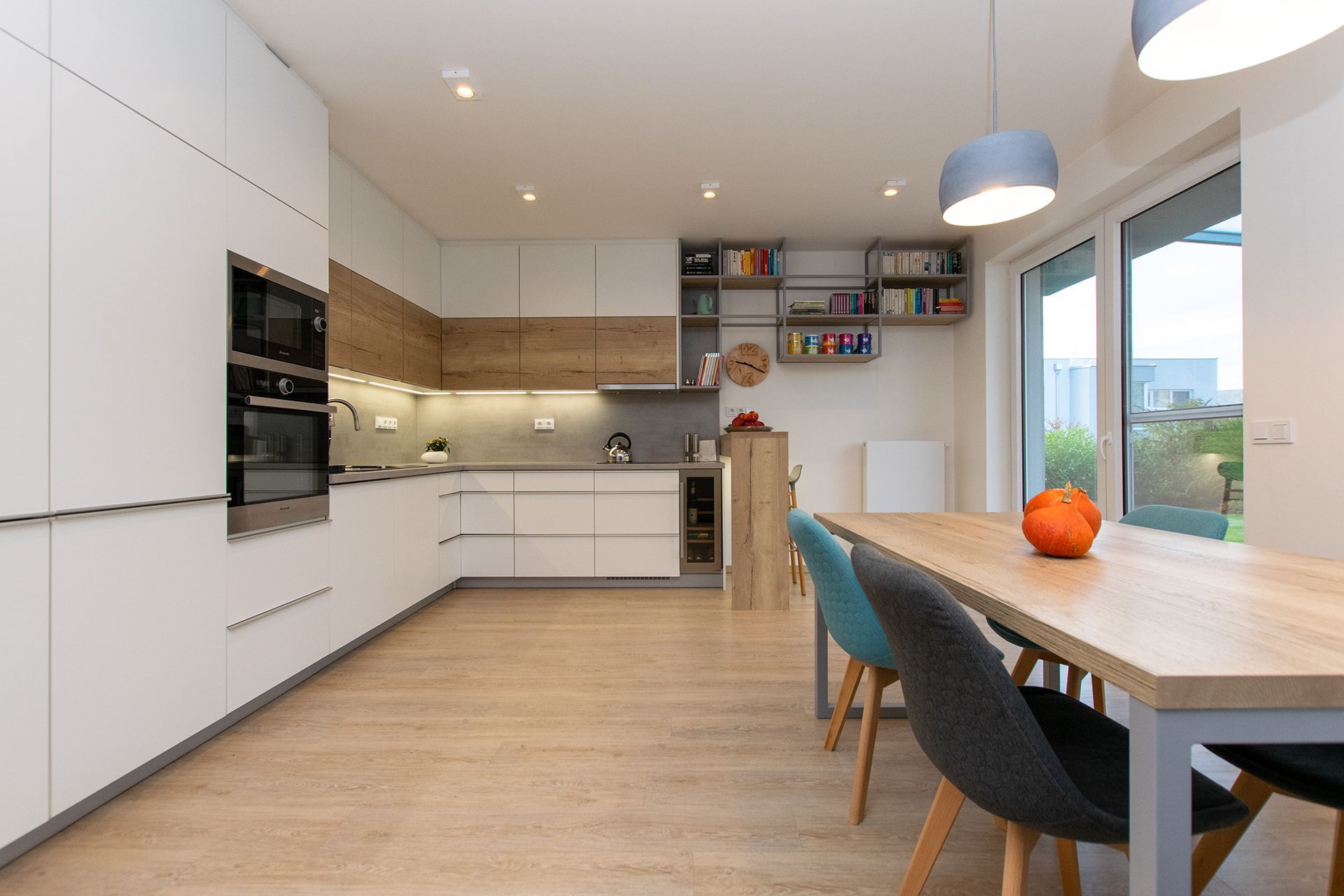 Když nás oslovil mladý pár, který se stěhoval z bytu do nového domu, jejich přáním bylo vytvořit příjemný a praktický hlavní obytný prostor. Chtěli místo, které jim poskytne dostatek volnosti, nebude působit přeplněně a zároveň bude funkční pro každodenní život. Klíčovým prvkem návrhu se stala kuchyň. Zvolili jsme jednoduchou barevnost, která působí čistě a nadčasově. Bílý nábytek jsme doplnili dřevodekorem a betonovou stěrkou, která dodává interiéru přirozenou syrovost a lehký industriální akcent. Do celkové harmonie jsme přidali tyrkysové akcenty – svěží barvu, která prostor zútulňuje a oživuje.