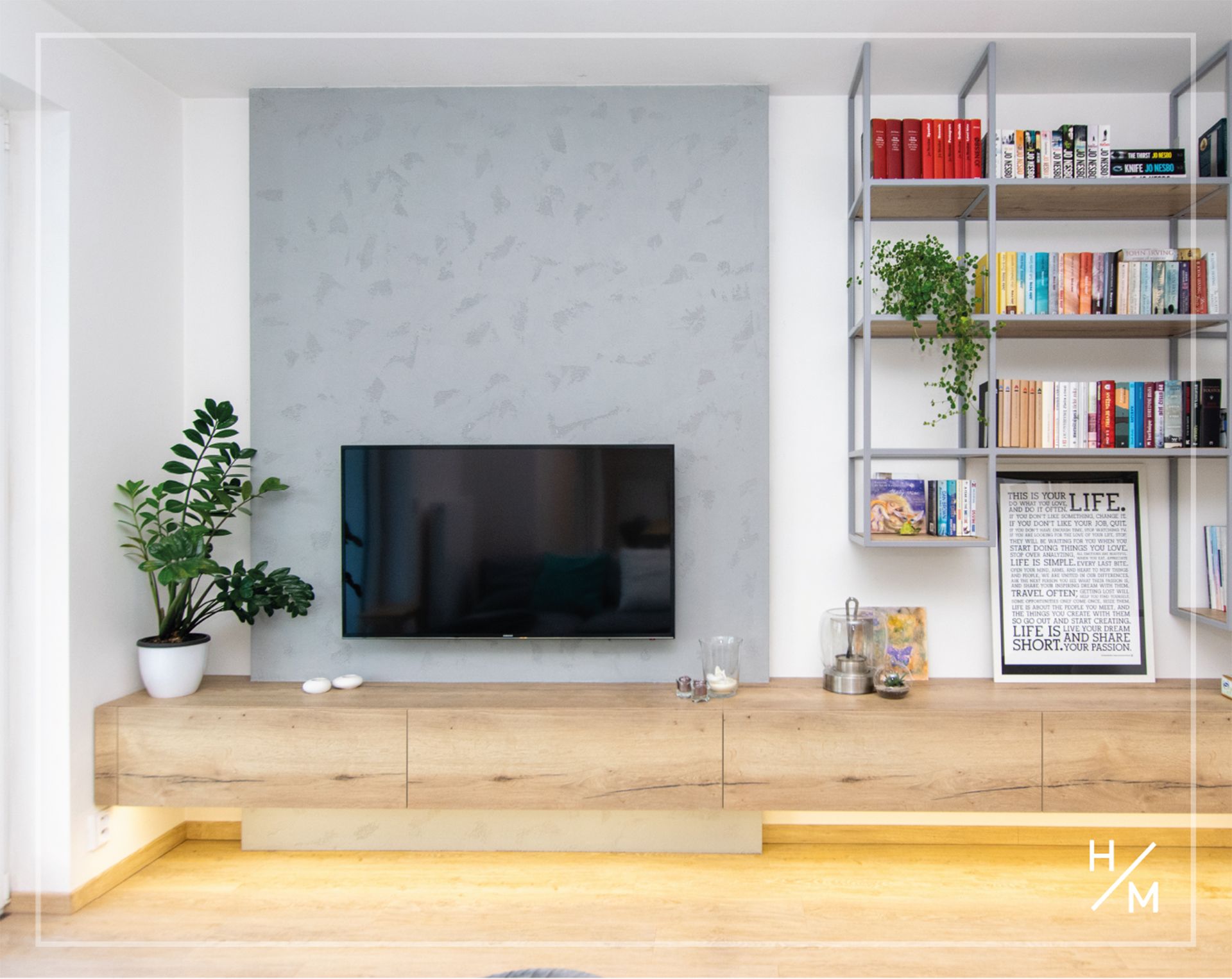 Dispozice byla řešena tak, aby umožňovala volný pohyb a přirozené proudění – od vstupu přes obývací část až na terasu, která se rozprostírá podél domu. Díky tomu je interiér otevřený, světlý a snadno propojitelný s exteriérem. Přáním klientů bylo zakomponovat do prostoru kovové regály. Ty jsme využili jako knihovny, které kromě úložné funkce přinášejí do interiéru také moderní a lehce industriální charakter. Výsledkem je kombinace jednoduchosti a praktičnosti s osobitými detaily. Vznikl tak prostor, který je nejen funkční a krásný, ale hlavně dává svým majitelům pocit domova – místa, kde se cítí volně, příjemně a kde mohou naplno žít svůj každodenní život.