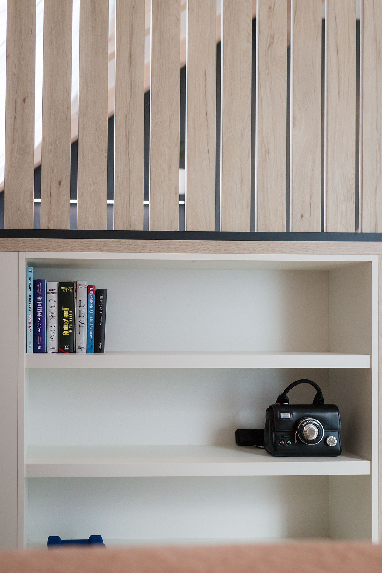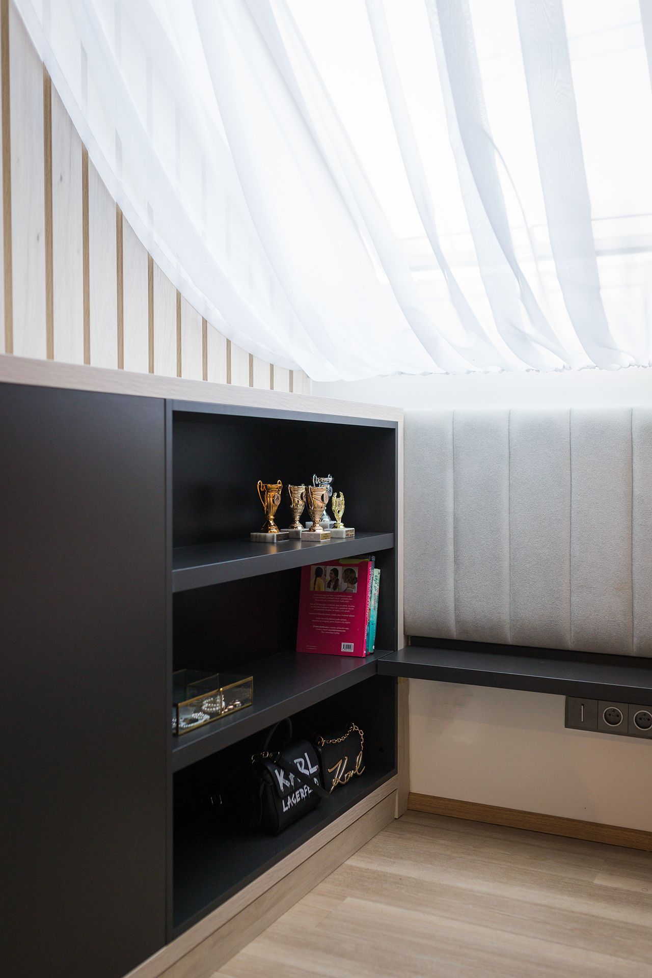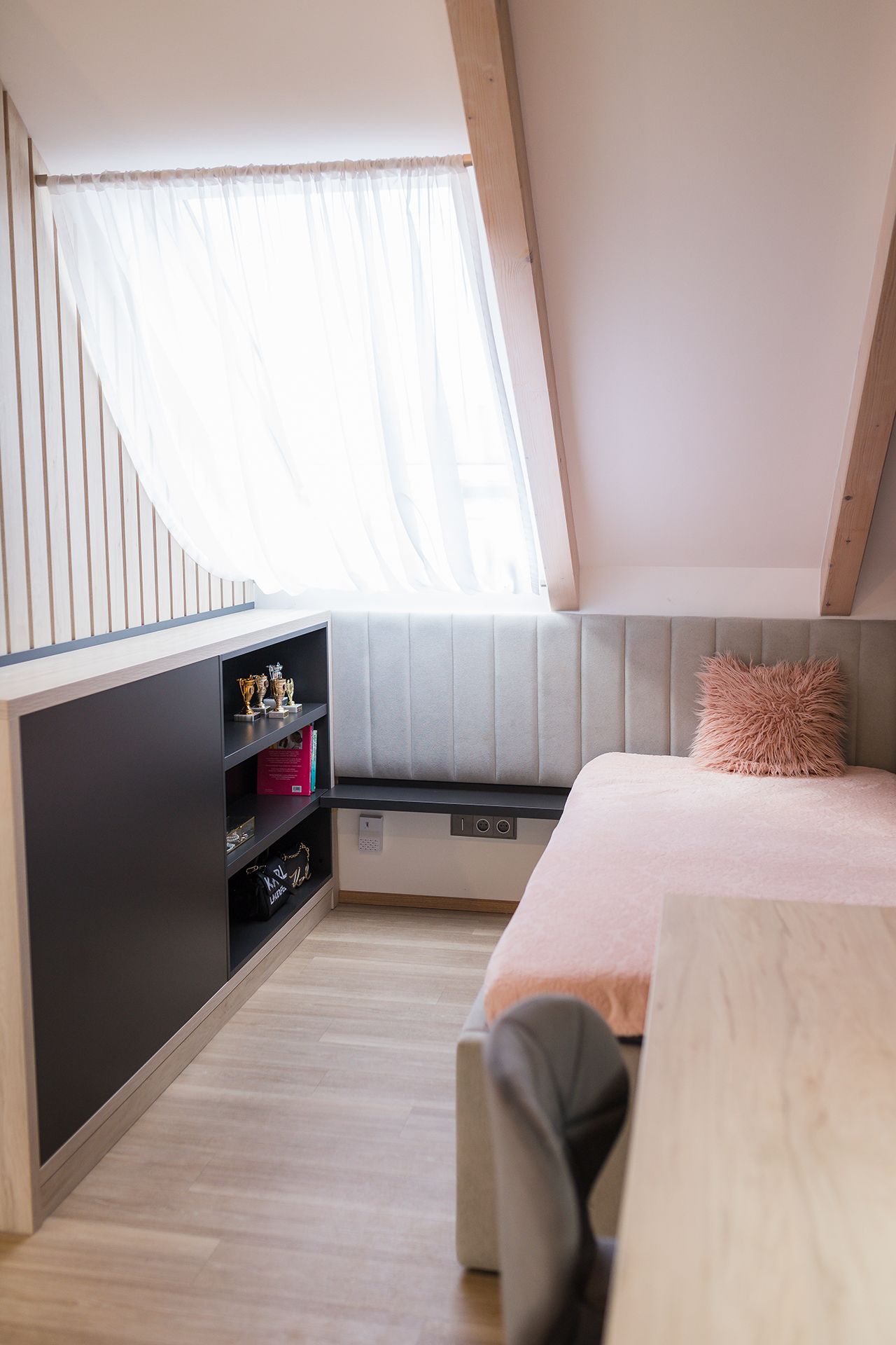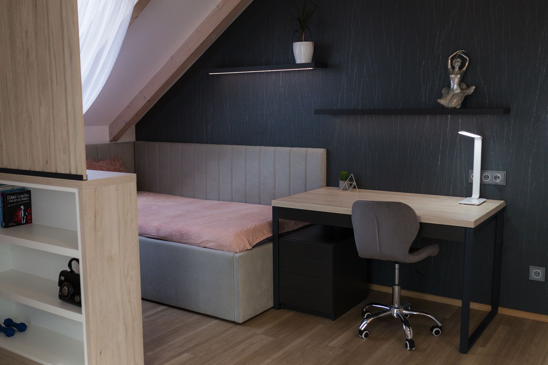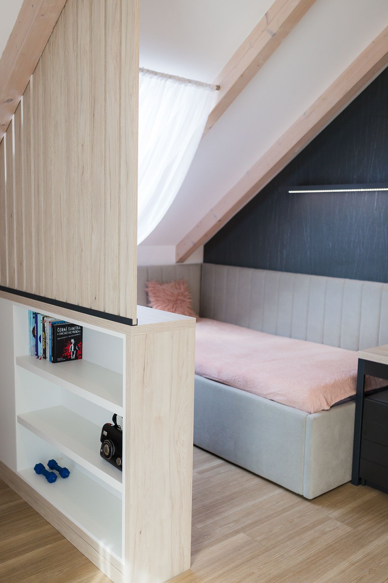 Klíčovým prvkem je subtilní dělicí prvek z dřevěných lamel, který pomáhá členit prostor vizuálně, aniž by narušoval přirozené světlo nebo vzdušnost místnosti. Kombinace neutrálních tónů, pudrových akcentů a černých detailů vytváří vyvážené a elegantní prostředí. Celek působí čistě a dospěle, ale stále dostatečně útulně a hravě pro každodenní život dvou mladých slečen.