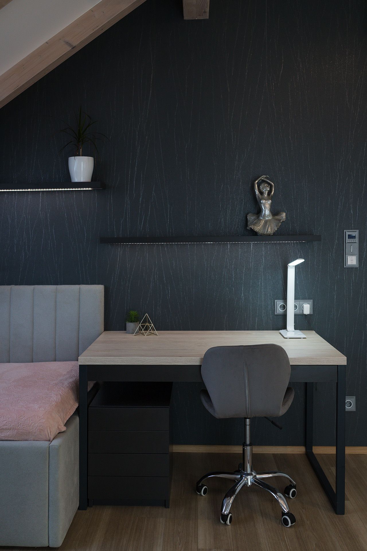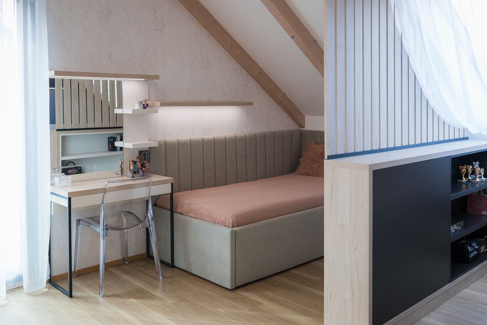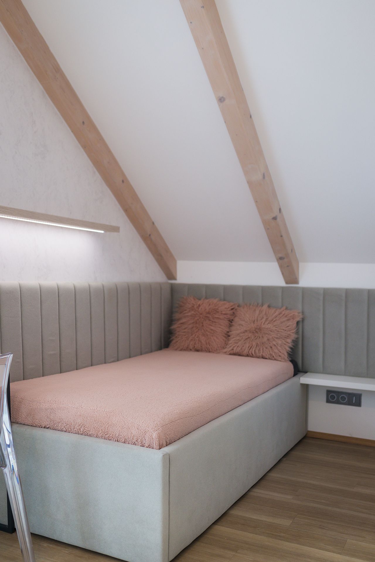 Půdní pokoj, kde má každá ze sester svůj prostor – a přitom zůstává celek harmonický.