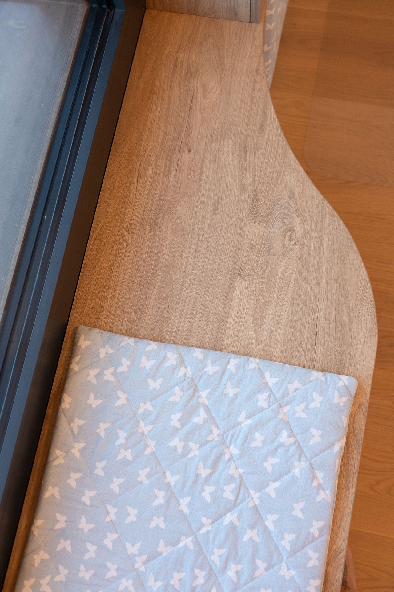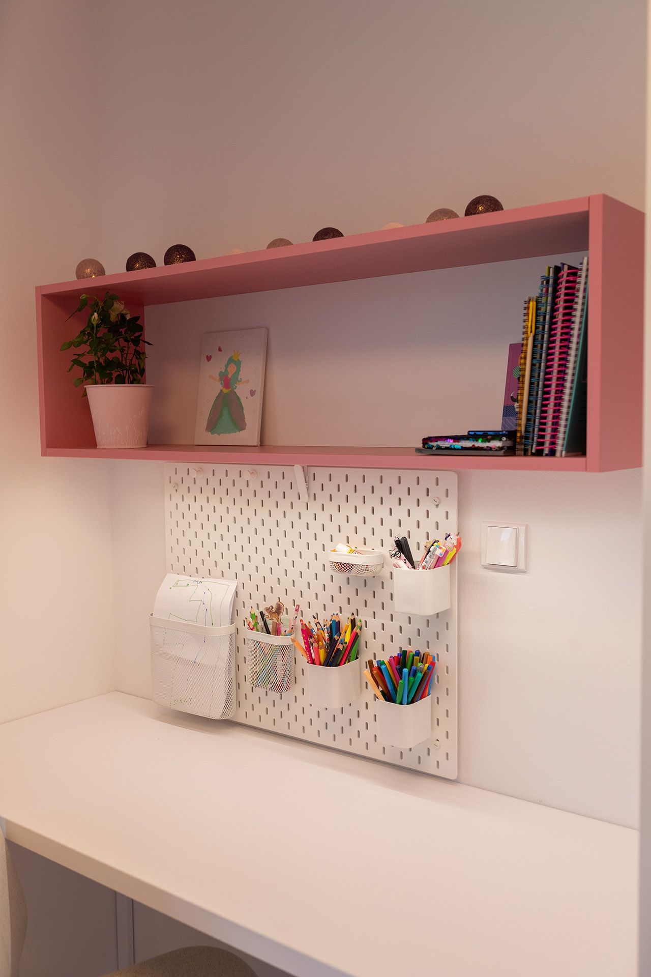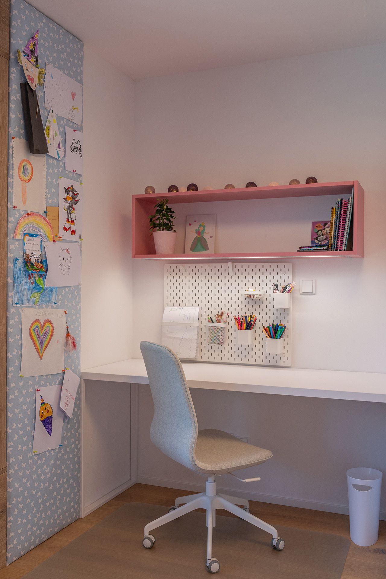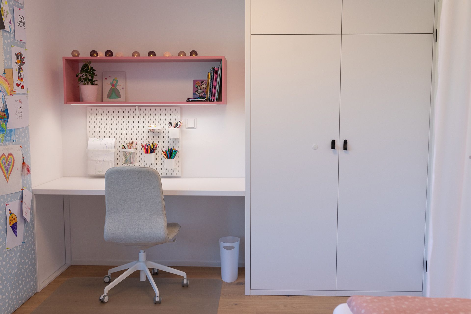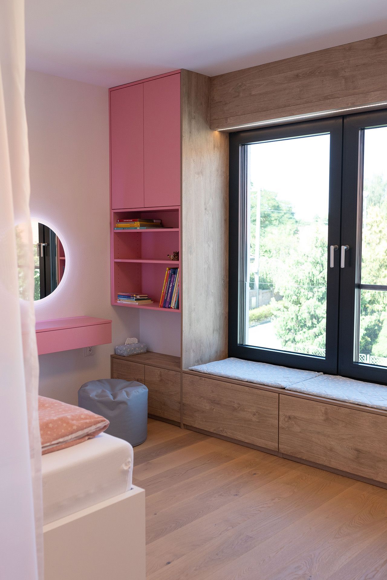 Praktické členění pokoje umožňuje dívce využívat prostor naplno – ať už si chce kreslit, učit se nebo odpočívat. Psací stůl s organizérem nabízí přehledné a motivující zázemí pro školní povinnosti i kreativní činnost. Nechybí dostatek úložných prostor, které pomáhají udržovat pořádek, ani malý beauty koutek s podsvíceným zrcadlem, který podporuje samostatnost a sebevyjádření. Speciálním místem se stalo sedací okno s výhledem do zahrady – ideální pro čtení nebo chvíle klidu. Pokoj je vybaven promyšleným osvětlením, které vytváří různé nálady podle denní doby nebo aktuální činnosti. Celek působí harmonicky, útulně a zároveň funkčně – přesně tak, jak si to přála jeho malá obyvatelka.