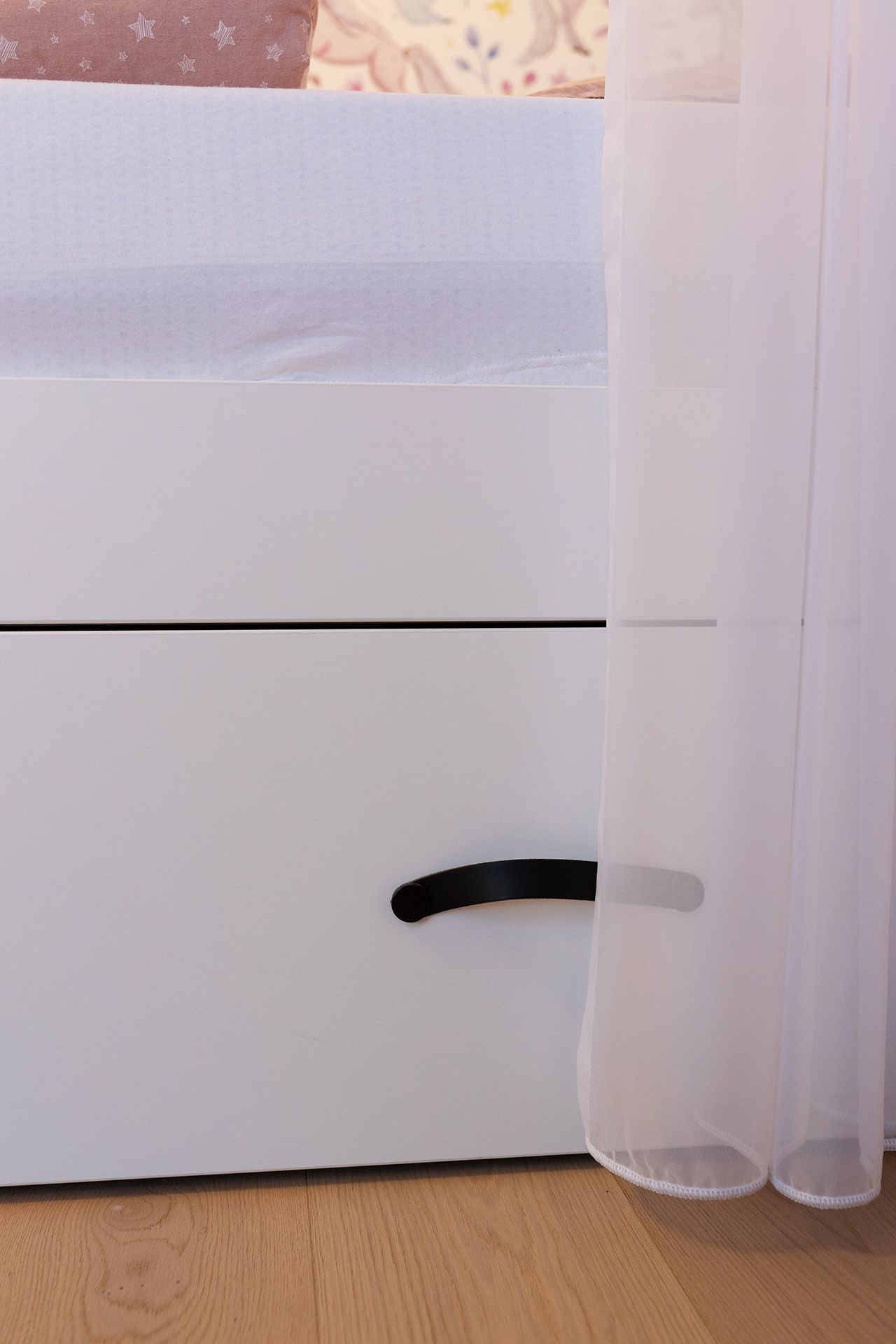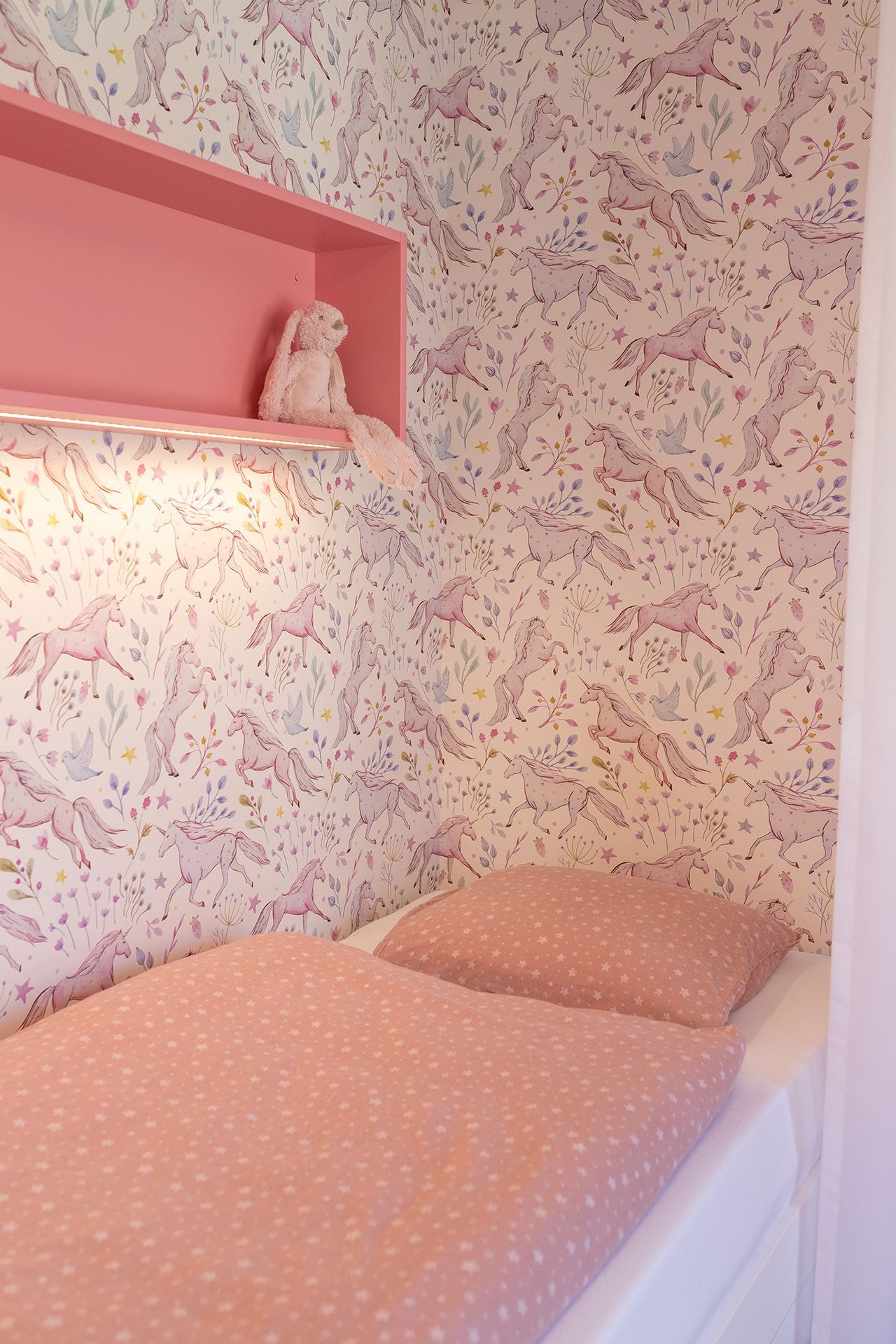 Dětský pokoj pro malou dívku jsme navrhli tak, aby vyhovoval jak jejím současným přáním, tak i potřebám do budoucna. Jemné růžové tóny, které se prolínají celým prostorem, vytvářejí hřejivou a přívětivou atmosféru, aniž by působily přehnaně sladce. Postel částečně oddělená záclonkami nabízí soukromí a evokuje svět pohádek, ve kterém může dítě snít i odpočívat. Tapeta s jednorožci dodává prostoru hravost a fantazii, zatímco celkové řešení zůstává čisté a nadčasové.