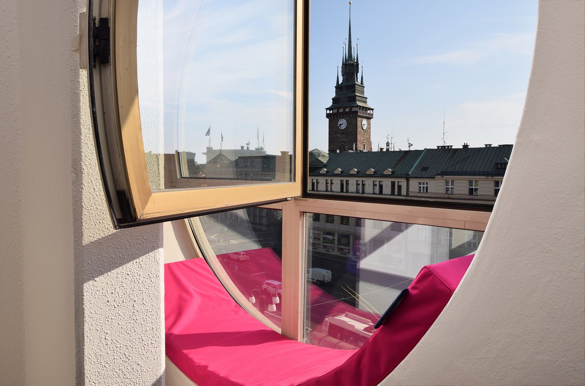Prostor kombinuje pracovní zóny s relaxačními. Pytle na sezení, dřevěné stolky a klidná zákoutí s výhledem do města poskytují ideální místo pro neformální setkání i individuální soustředění. Cedulky z překližky, nápadité značení místností a použití přírodních materiálů podtrhují přístupnost a kreativní charakter celého inkubátoru.