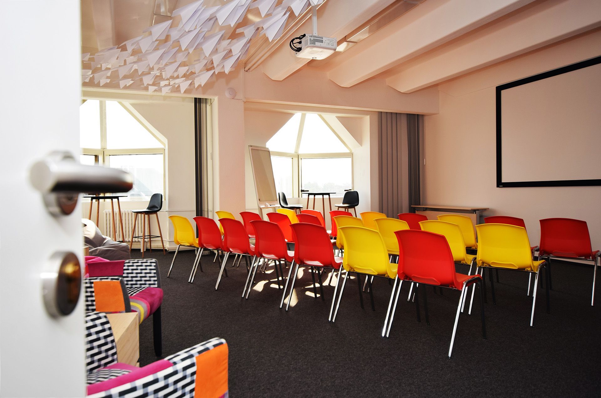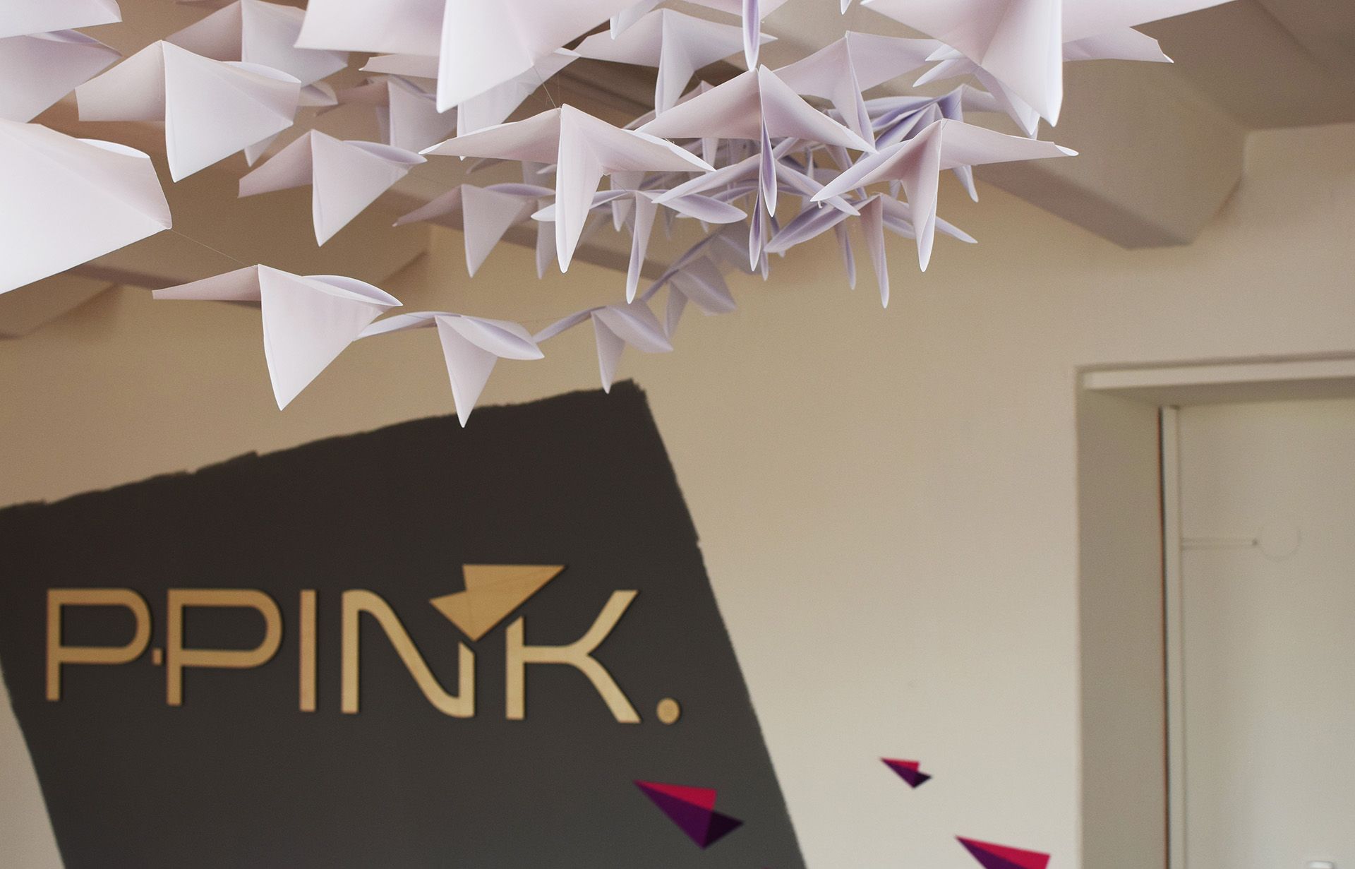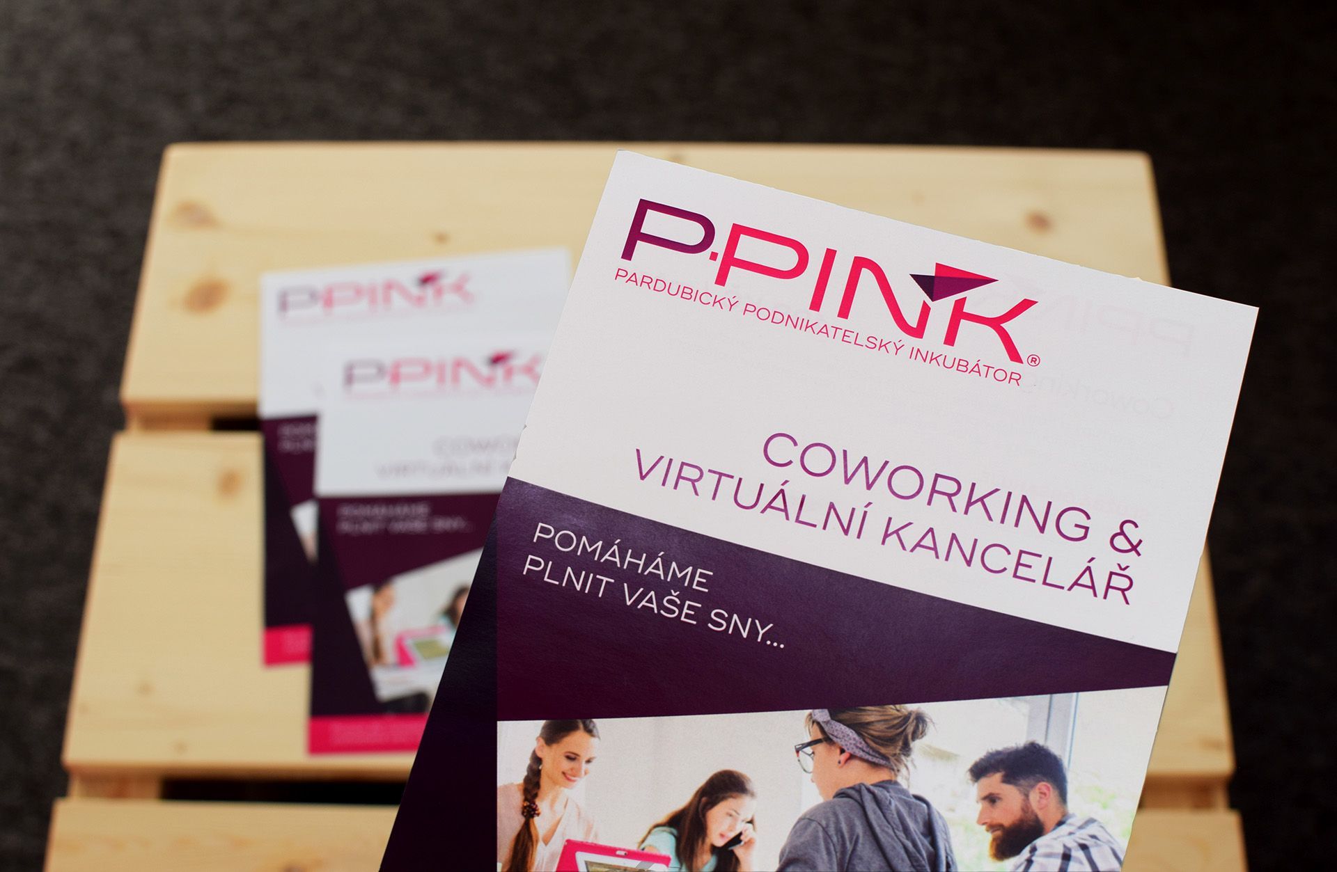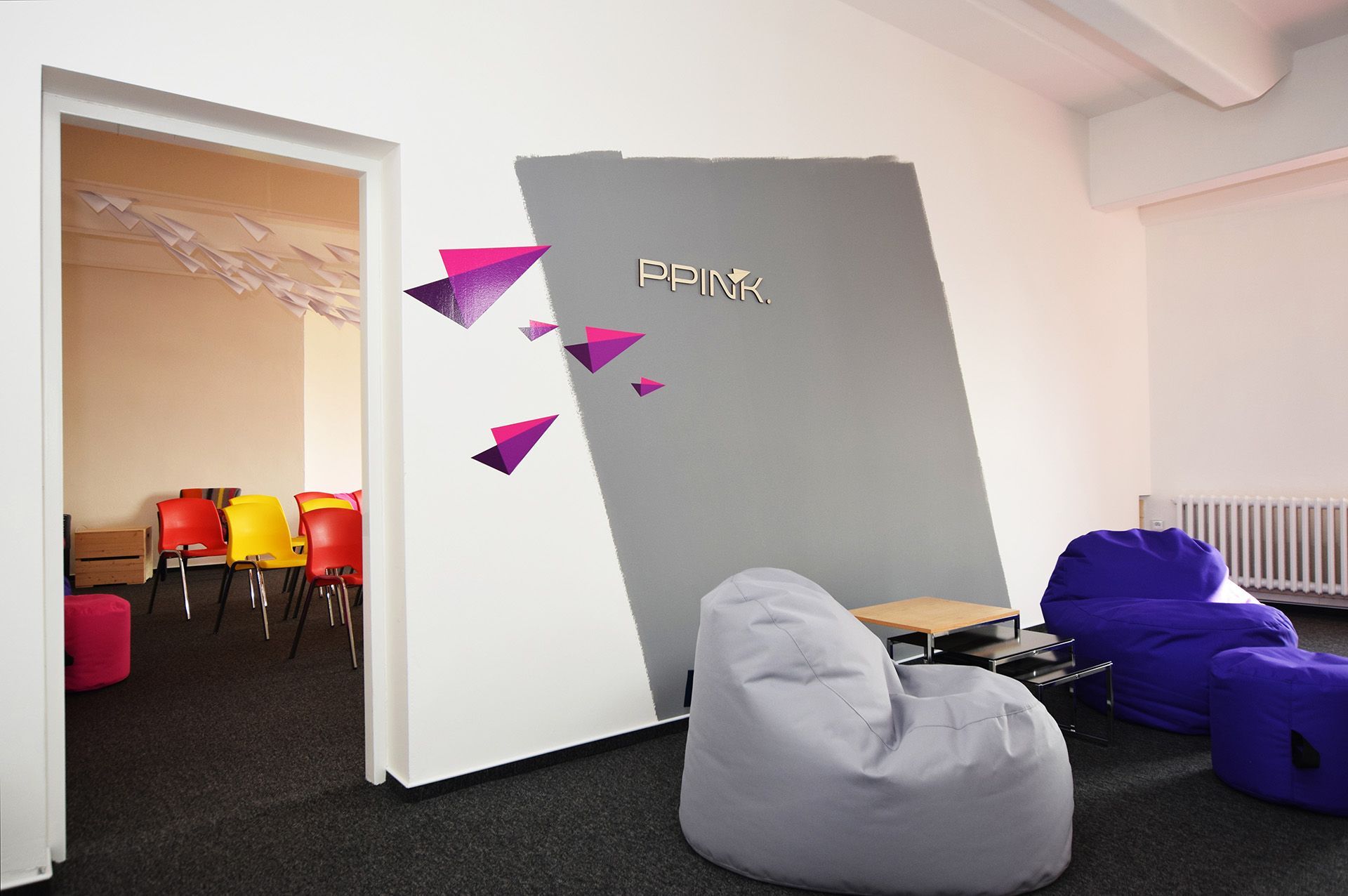Interiér v nejvyšším patře modernistické budovy v centru Pardubic nabízí výhledy na městskou věž i světlé, přehledné zázemí. Barevné plastové židle v přednáškové místnosti, hravé detaily a výrazné grafické prvky na stěnách vytvářejí prostředí, které motivuje k aktivní práci. Značka P.PINK se propisuje do každého prvku – od loga přes výběr barev až po symboliku papírových vlaštovek na stropě, které odkazují na start projektů i rozlet nových nápadů.