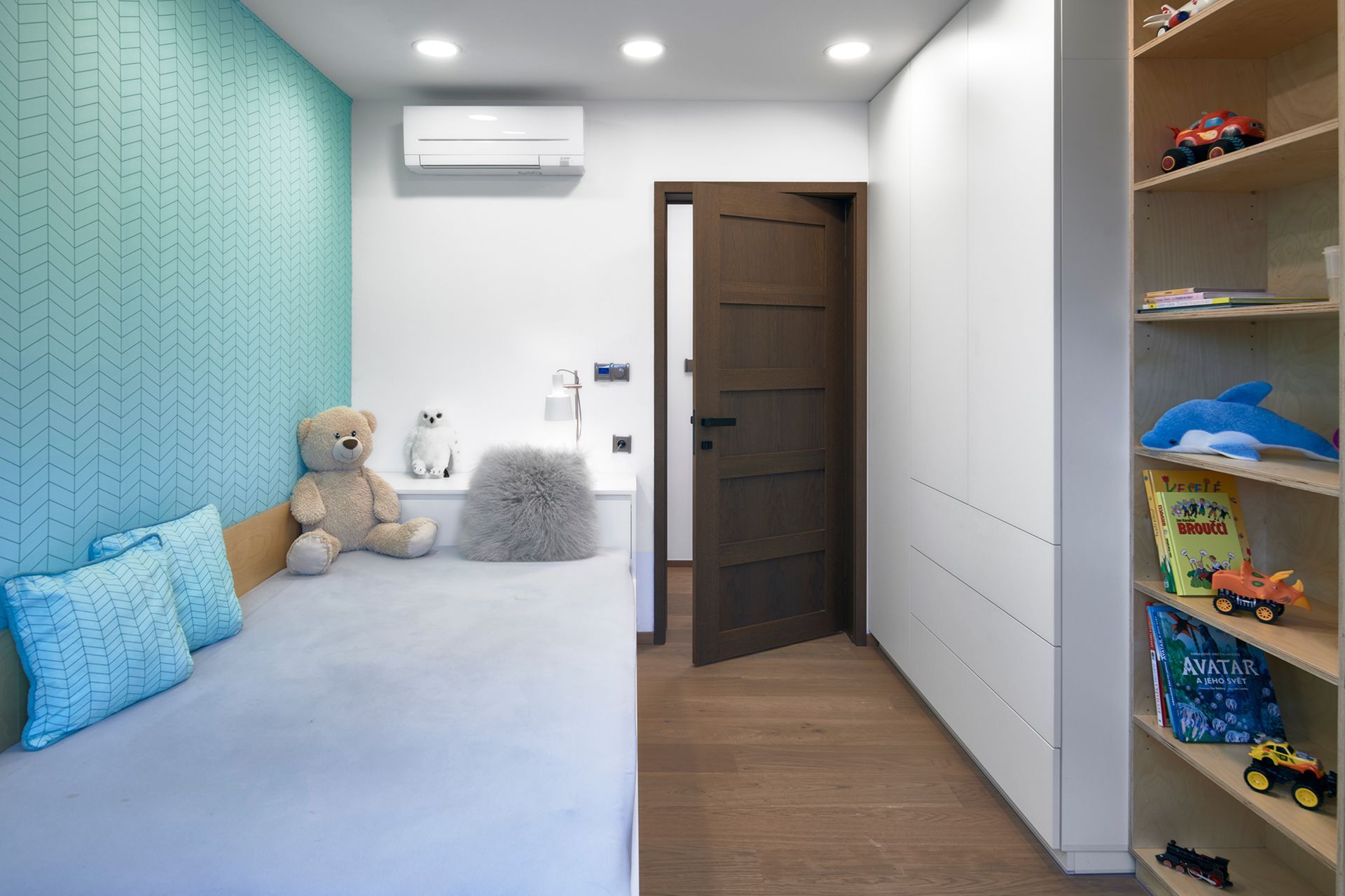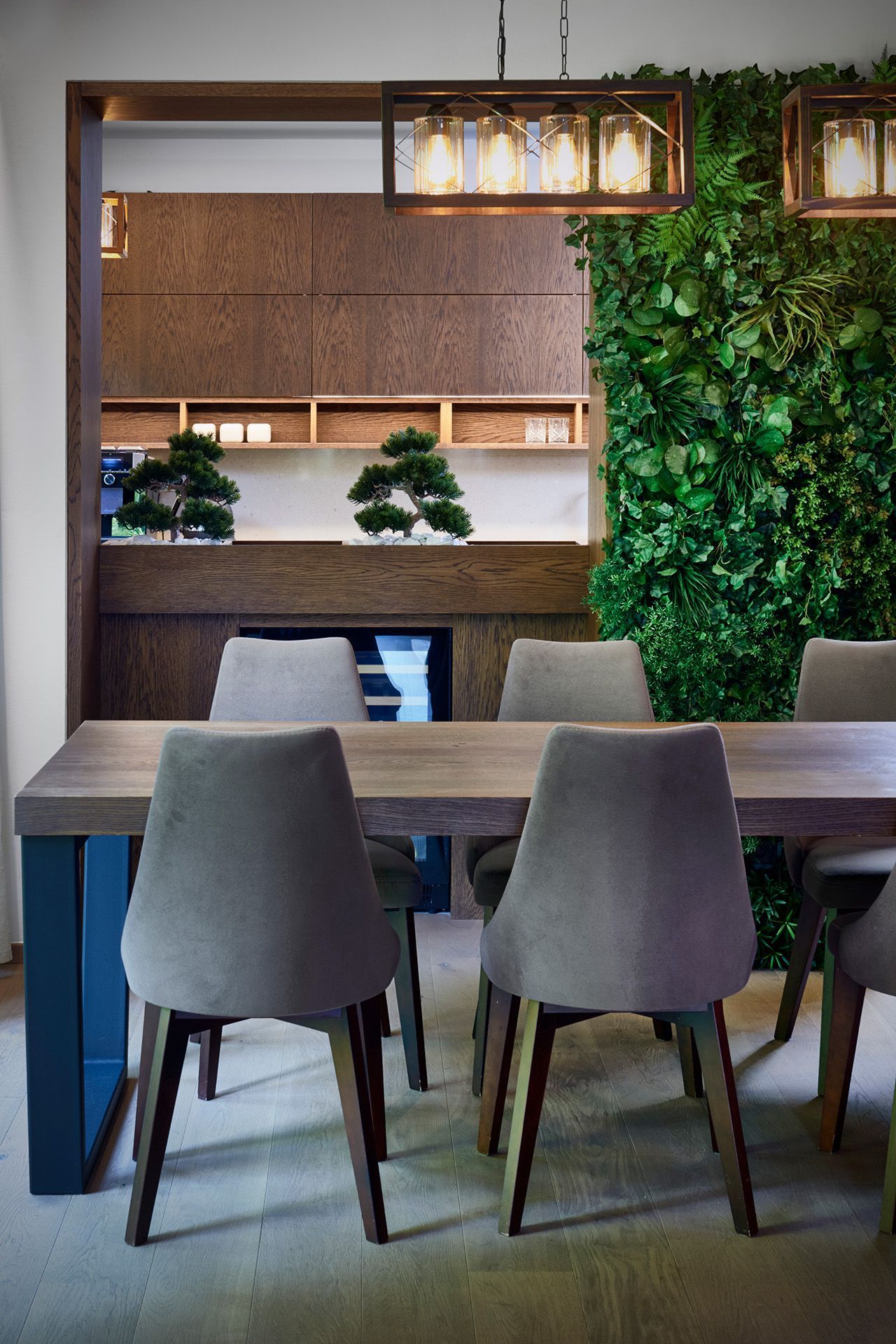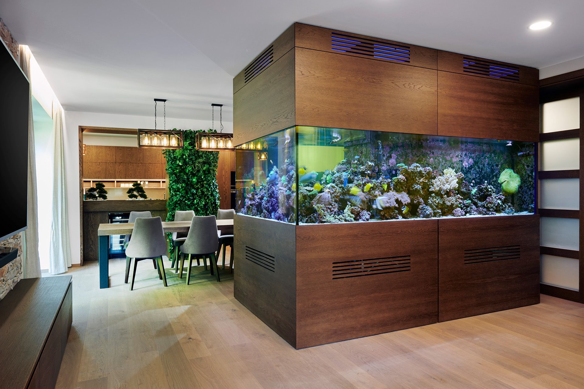 Dominantním prvkem společenské části domu je velké mořské akvárium vestavěné do stěny, které na první pohled upoutá a zároveň propojuje jídelnu, kuchyni a obývací zónu. Jeho klidná vodní hladina a barevný svět mořských ryb vytvářejí unikátní atmosféru, která interiéru dodává originalitu i výjimečný charakter. Celý prostor je laděn do teplých tónů dubového dřeva a doplněn o vertikální zelenou stěnu i pečlivě umístěné bonsaje, jež přinášejí do domu pocit harmonie s přírodou. Promyšlené osvětlení podporuje jednotlivé funkce – nad jídelním stolem zaujmou industriální svítidla, zatímco v koupelnách a wellness zóně hraje prim nepřímé a atmosférické světlo. Obývací část je řešena prostorně a vzdušně, s nábytkem na míru, který kombinuje hladké a přírodně strukturované povrchy. Příjemným detailem je vinotéka elegantně vestavěná pod schodištěm, která ukazuje smysl pro využití každého prostoru.