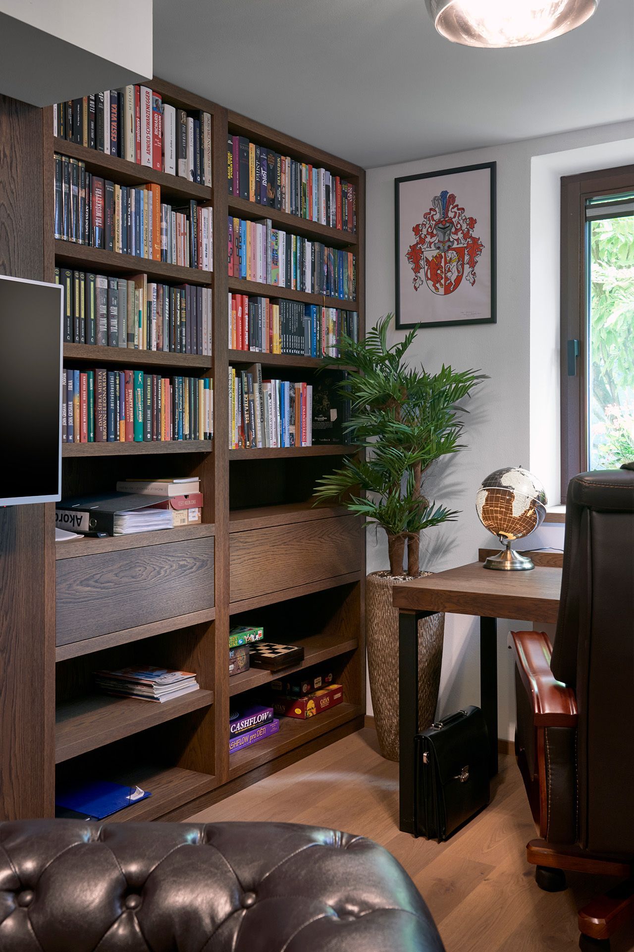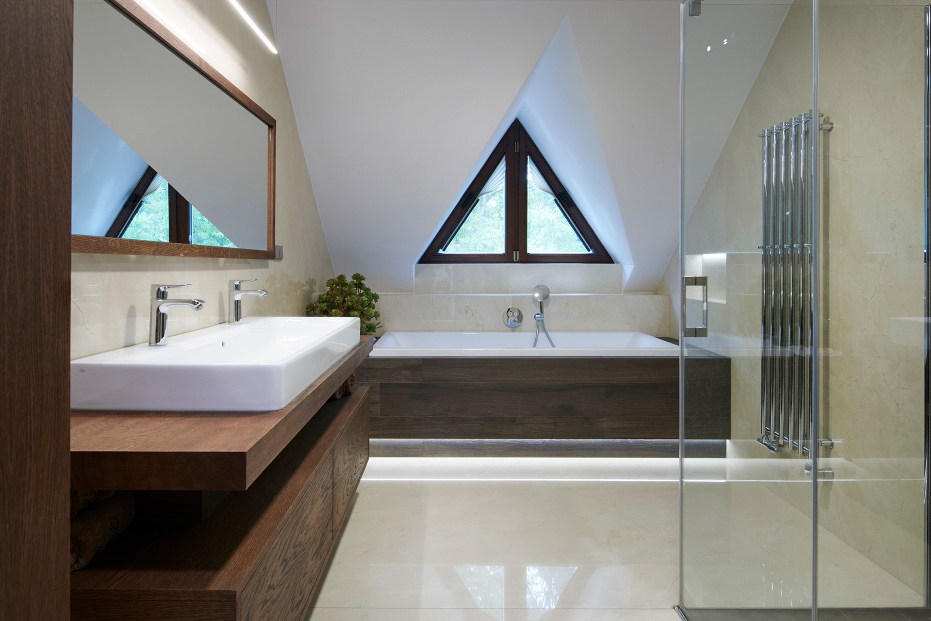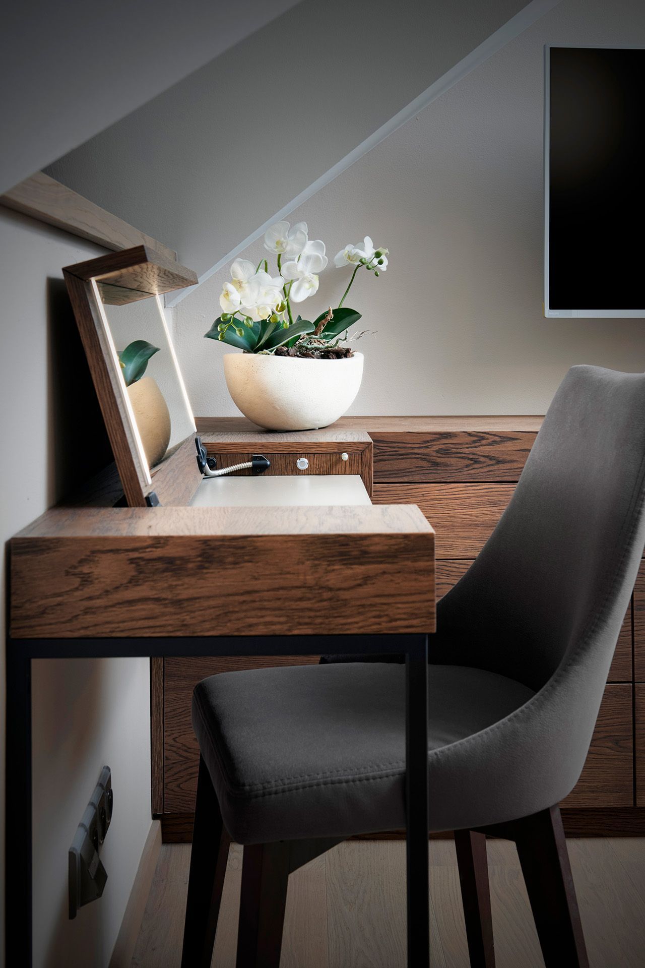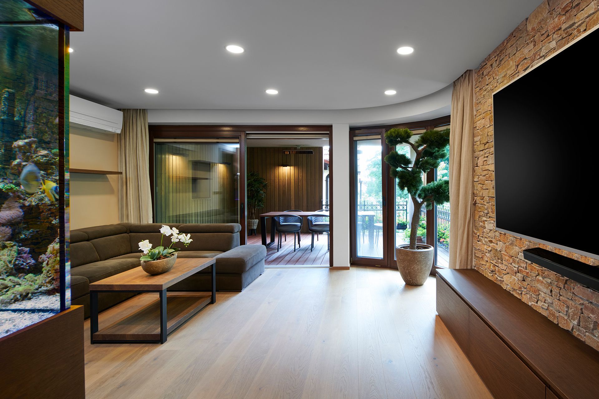 Dominantním prvkem společenské části domu je velké mořské akvárium vestavěné do stěny, které na první pohled upoutá a zároveň propojuje jídelnu, kuchyni a obývací zónu. Jeho klidná vodní hladina a barevný svět mořských ryb vytvářejí unikátní atmosféru, která interiéru dodává originalitu i výjimečný charakter. Celý prostor je laděn do teplých tónů dubového dřeva a doplněn o vertikální zelenou stěnu i pečlivě umístěné bonsaje, jež přinášejí do domu pocit harmonie s přírodou. Promyšlené osvětlení podporuje jednotlivé funkce – nad jídelním stolem zaujmou industriální svítidla, zatímco v koupelnách a wellness zóně hraje prim nepřímé a atmosférické světlo. Obývací část je řešena prostorně a vzdušně, s nábytkem na míru, který kombinuje hladké a přírodně strukturované povrchy. Příjemným detailem je vinotéka elegantně vestavěná pod schodištěm, která ukazuje smysl pro využití každého prostoru.