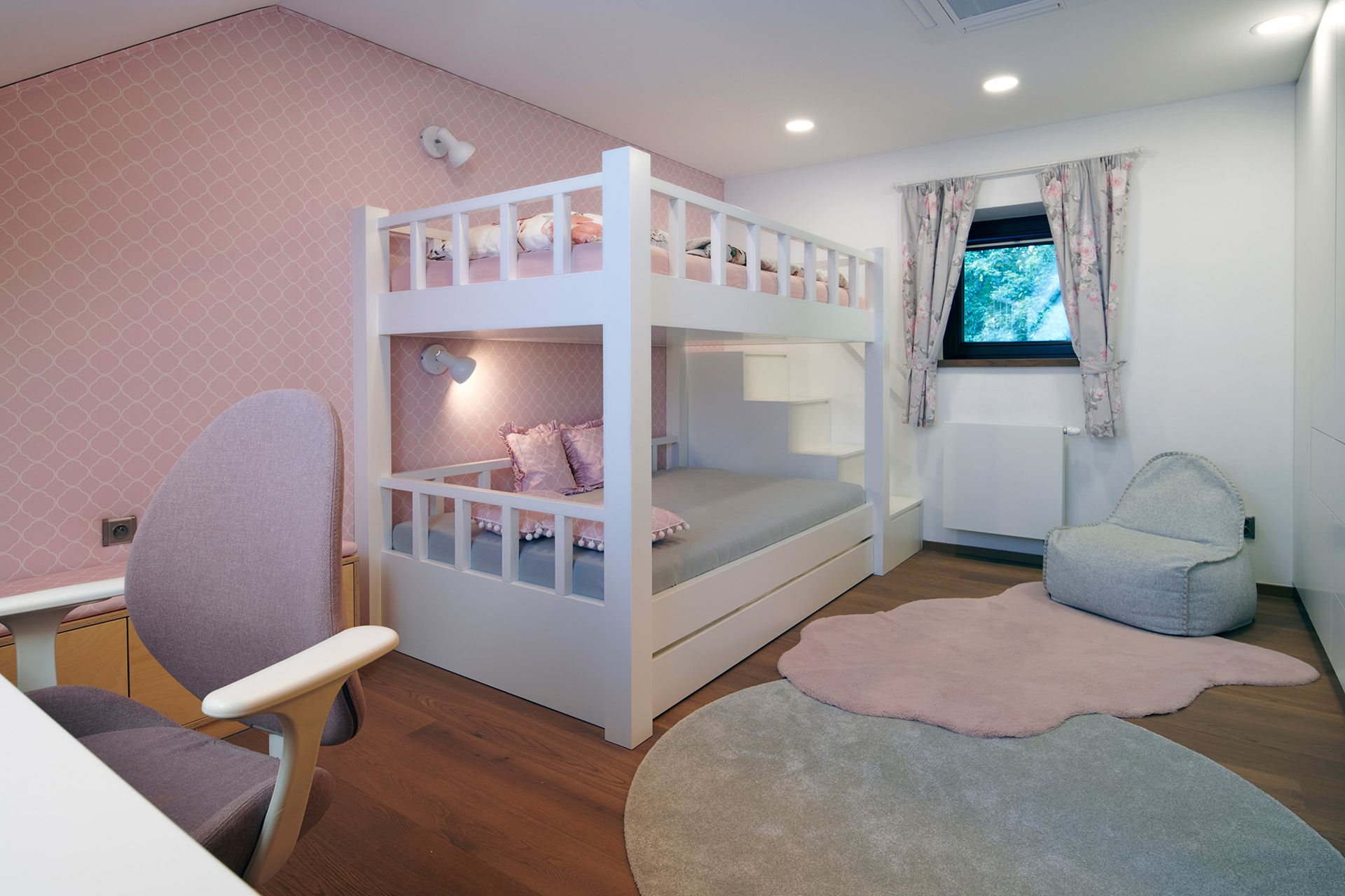 Dům disponuje třemi dětskými pokoji, z nichž každý je řešen individuálně tak, aby poskytoval pohodlí i dostatek úložného prostoru. Podkroví slouží jako multifunkční hudební a relaxační zóna – najdeme zde klavír, posezení i audiovizuální techniku. Do tohoto prostoru je možné vyjet výtahem, což podtrhuje komfort i originální řešení domu. V patře nechybí soukromá knihovna s pracovním koutem a přímým výhledem do zahrady, stejně jako prostorná koupelna se solitérní vanou umístěnou pod střešním oknem. Skutečnou oázou klidu je wellness část s finskou saunou, sprchou a relaxační místností obloženou přírodním kamenem, doplněnou o dřevěný nábytek na míru. Suterén ukrývá hned dvě tělocvičny určené pro různé typy cvičení, což dává domu rozměr aktivního i zdravého životního stylu. K tomu se přidává domácí posilovna a rozlehlá terasa orientovaná do zeleně, která v letních měsících přirozeně rozšiřuje obytný prostor směrem ven. Tento dům díky své velikosti a množství funkčních i odpočinkových zón nabízí nejen elegantní bydlení, ale i široké možnosti pro relaxaci, společenský život a aktivní trávení času celé rodiny.